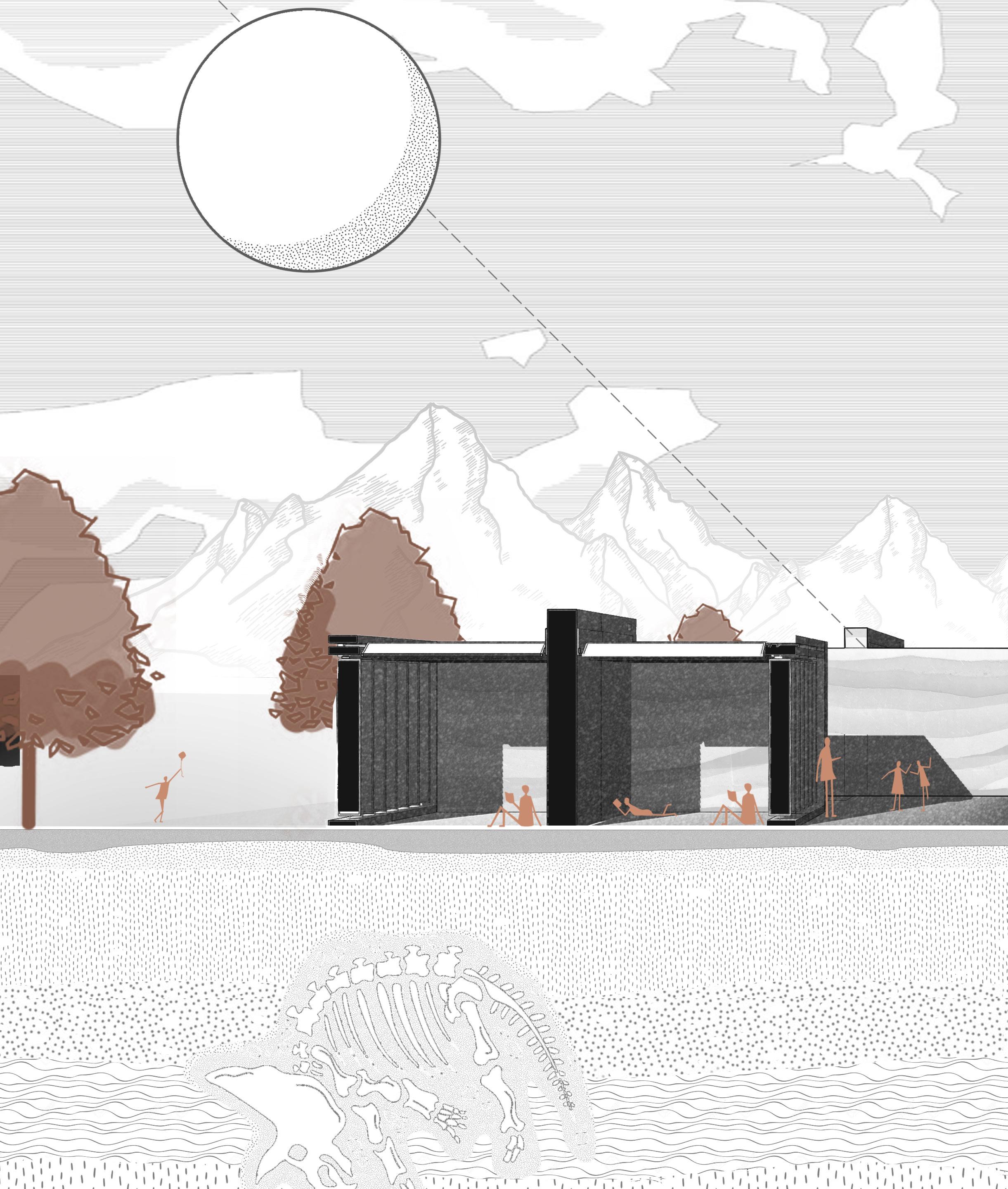 The climate system of the design combines vernacular practices, such as the thermal mass principle of rammed earth walls and windcatcher systems, with innovative materials and systems available from regions known for their advancements in research and technology, showcasing progress in sustainable design principles. This includes utilizing phase-changing materials, light weight aerogel insulation, and Trombe wall principles achieved through a unrolling membrane. The lamellas within the system are manually turnable, allowing adaptability to specific scenarios. Teh system is deployed in disassembled state and easily assembled on site by unskilled workers