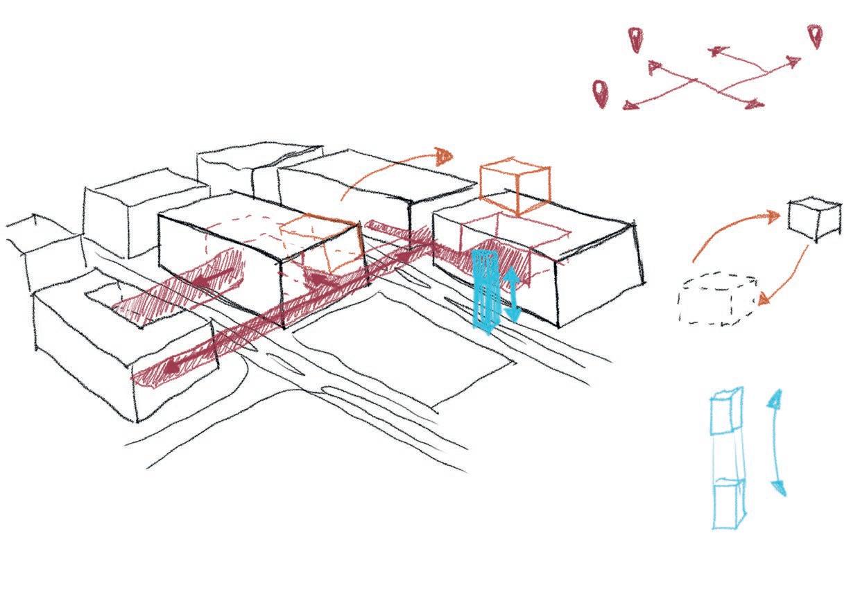 Main concept of it is creating a deck that would enable moving of people between buildings above the streets. The deck connects neighbouring buildings allowing flow of people and creating new “streets”.