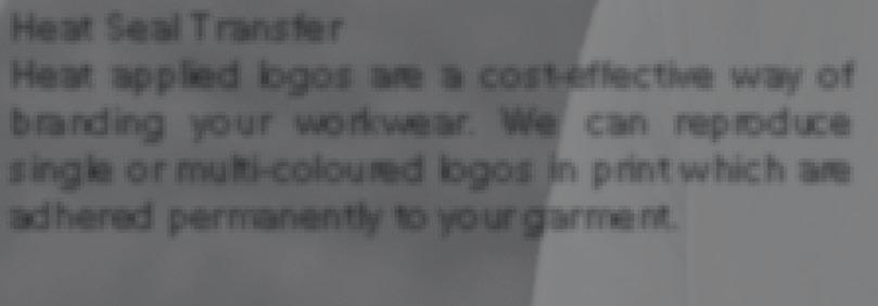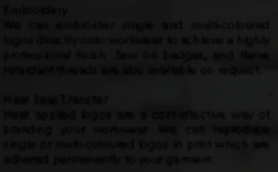workwear We can reproduce single or multi-coloured logos in print which are adhered permanently to your garment.