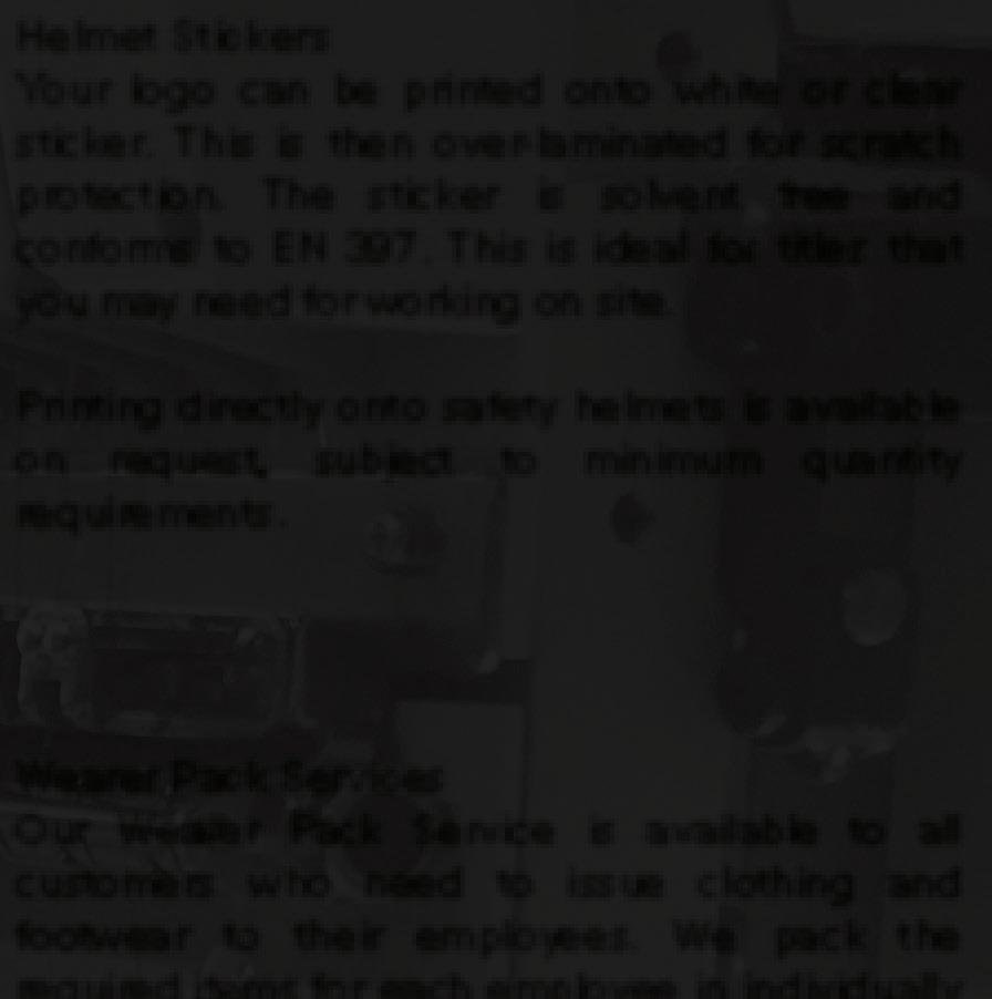 Your logo can be printed onto white or clear sticker This is then over-laminated for scratch protection. The sticker is solvent free and conforms to EN 397 This is ideal for titles that you may need for working on site.