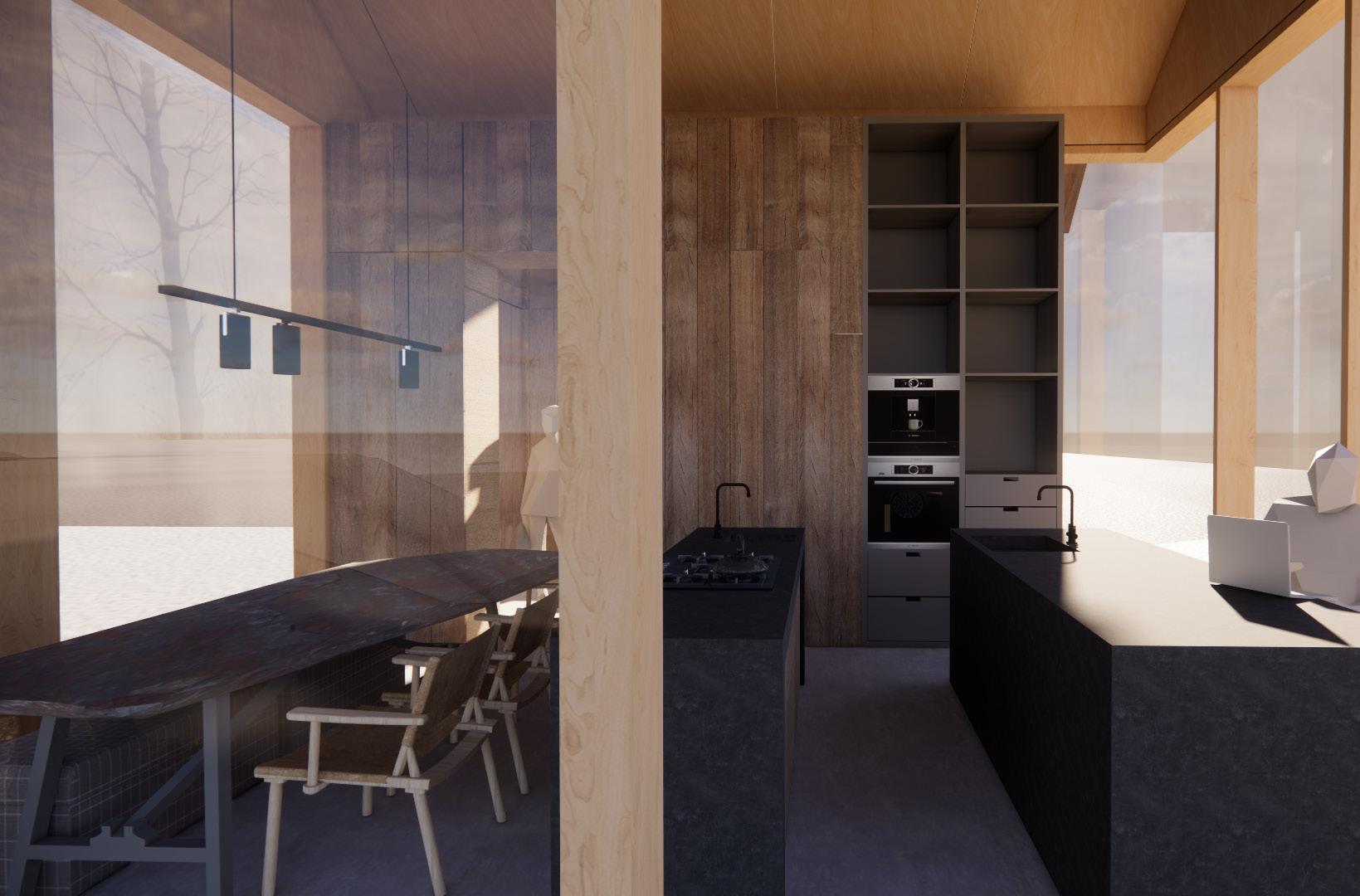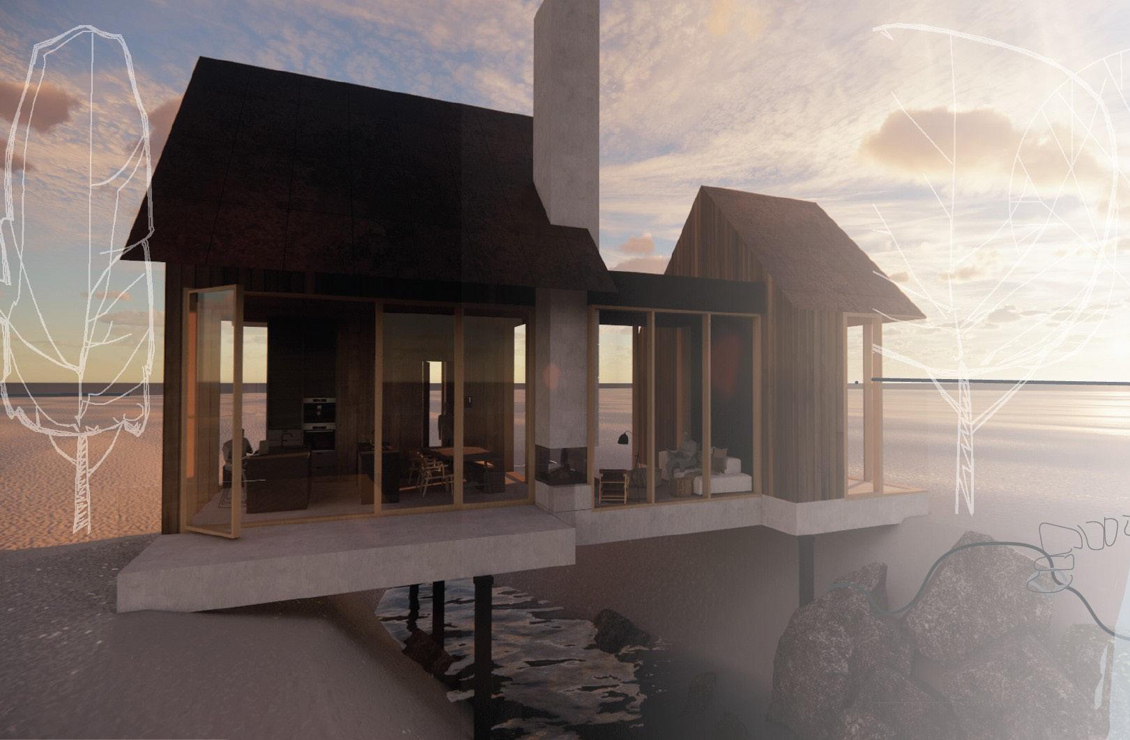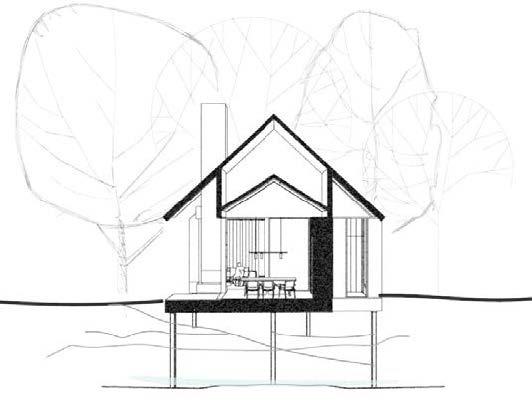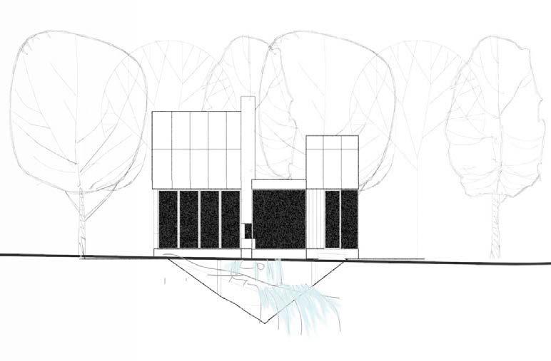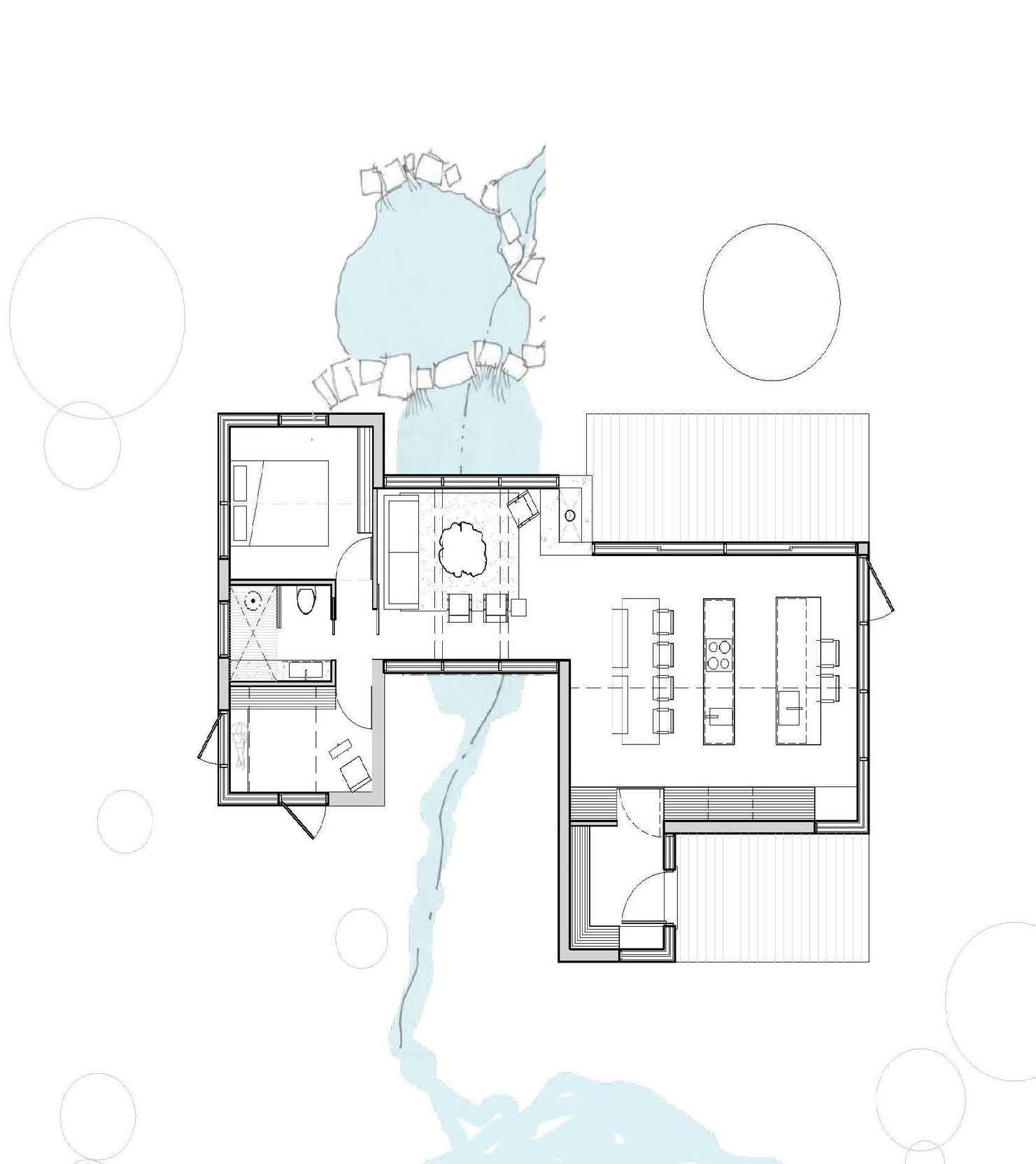 Dans l’idée d’une maison autonome et durable, les notions d’énergie naturelle et de gains solaires ont guidé la conception de cette résidence contemporaine à St-Augustin-de-Desmaures. Le projet de Creekside Cabin a été conçu à la fois comme une retraite et une résidence à temps partiel destiné aux barbecues d’été, aux retraites de pêche et aux réunions de famille. La résidence s’articule au-dessus d’un ruisseau qui devient une entité architecturale offrant son expérience visuelle autant à l’intérieur qu’à l’extérieur.