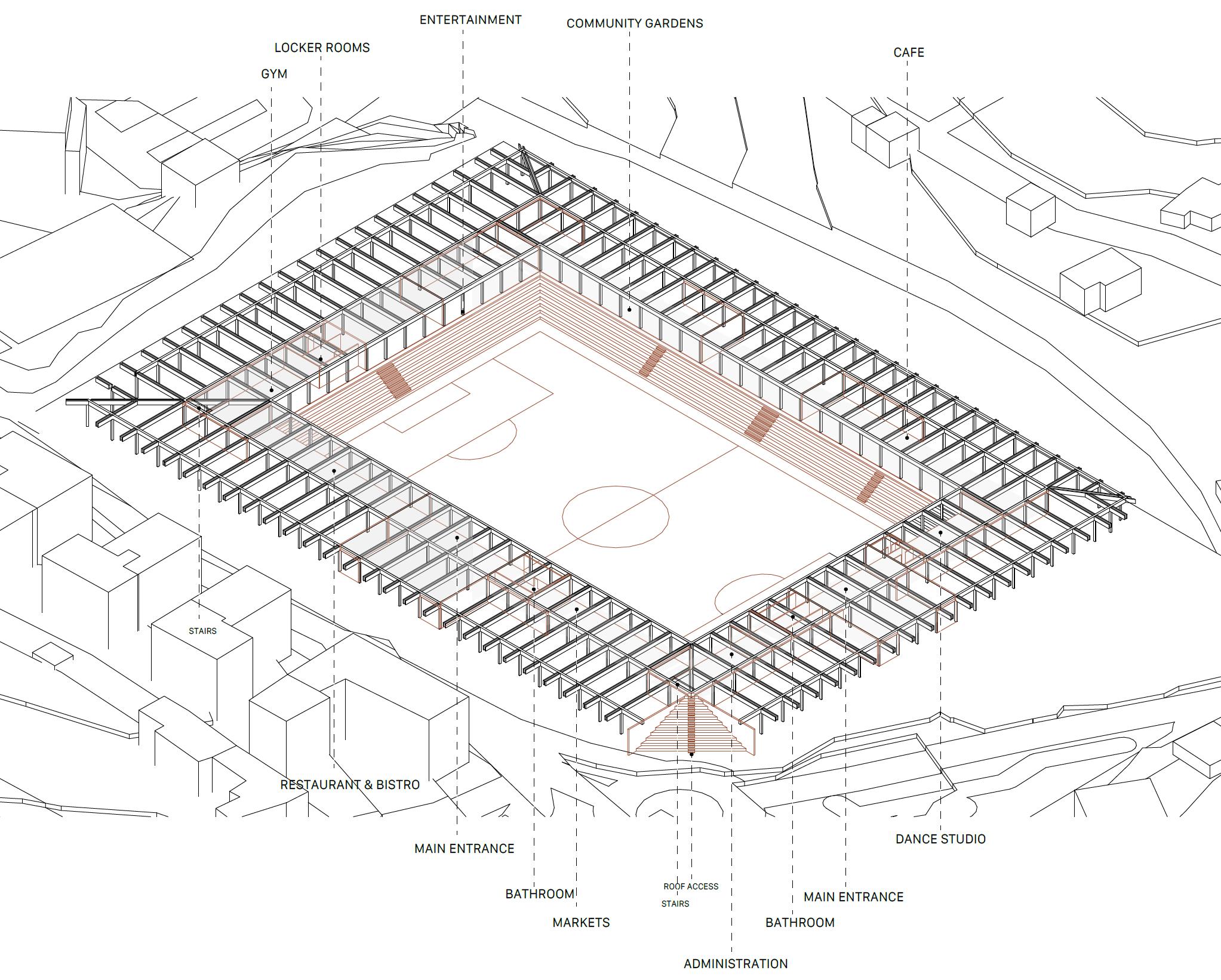 Le stade proposé est situé à proximité du campus universitaire et au cœur de la ville. Pour ces raisons, cet emplacement est non seulement utilisé pour les sports, mais aussi comme point de convergence pour la communauté, destiné à accueillir les rassemblements communautaires, repas, moments de détentes et interactions sociales, en plus d’être un levier à la situation économique actuelle de la ville.