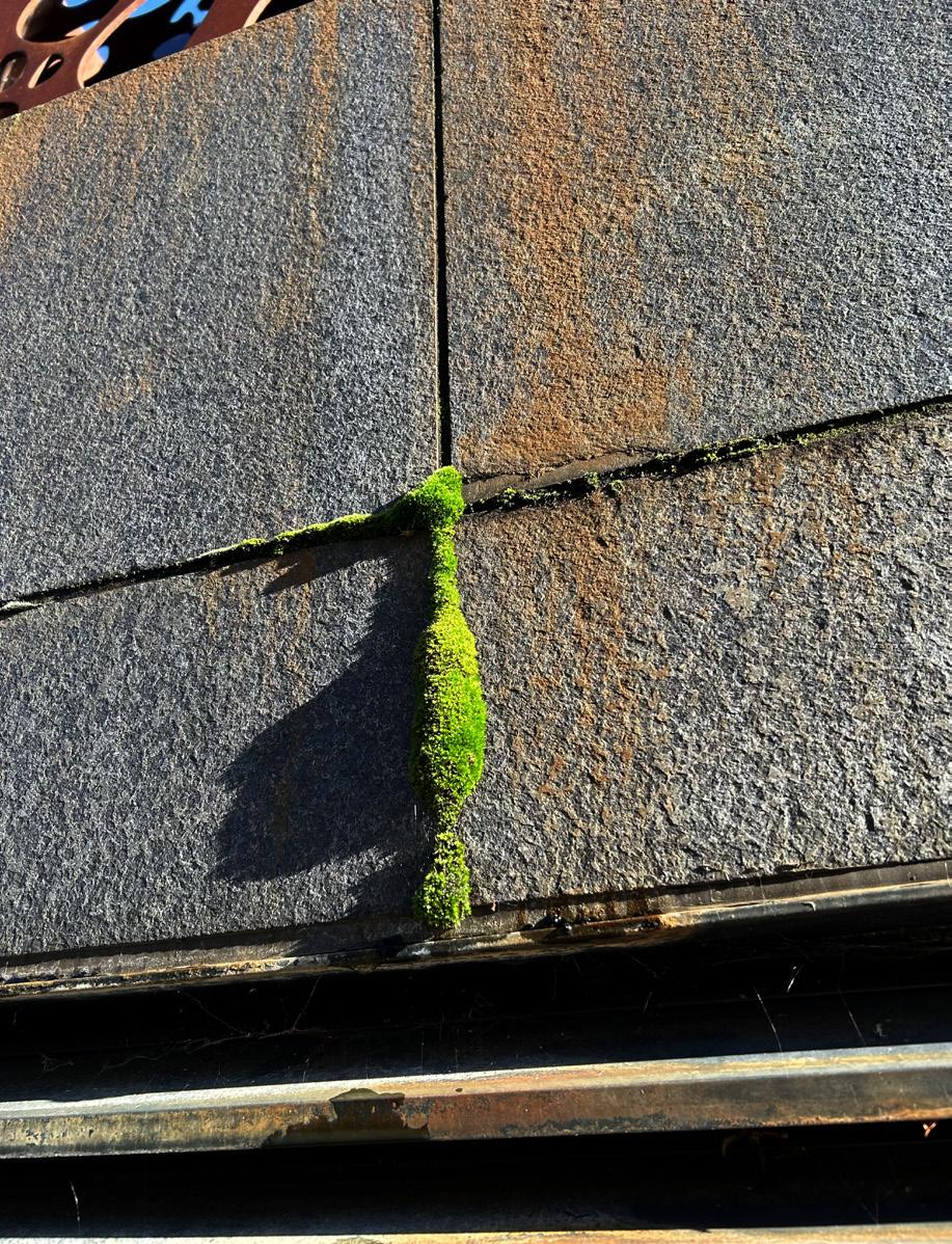 Fig. 35 Wilks, A. (2023) Green Moss [Leucobryum Glaucum] Growing in the Gaps Eroded Between Stone Façade Panels. Oxford.