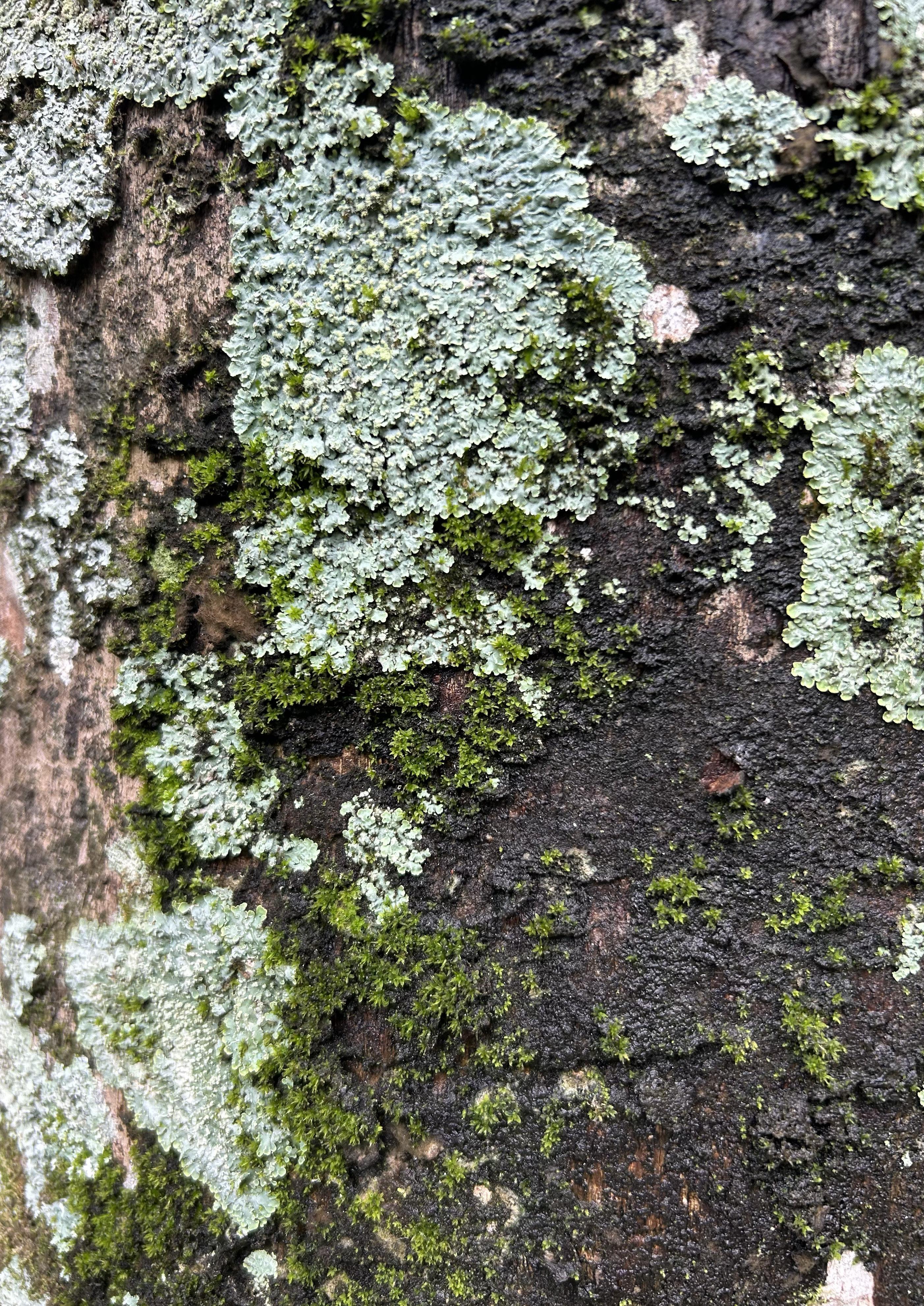 (Next page) [Fig. 2] Lichen [Parmelia caperata] and green moss [Dicranum scoparium] growing on a tree trunk in Sri Lanka (Wilks, 2023)