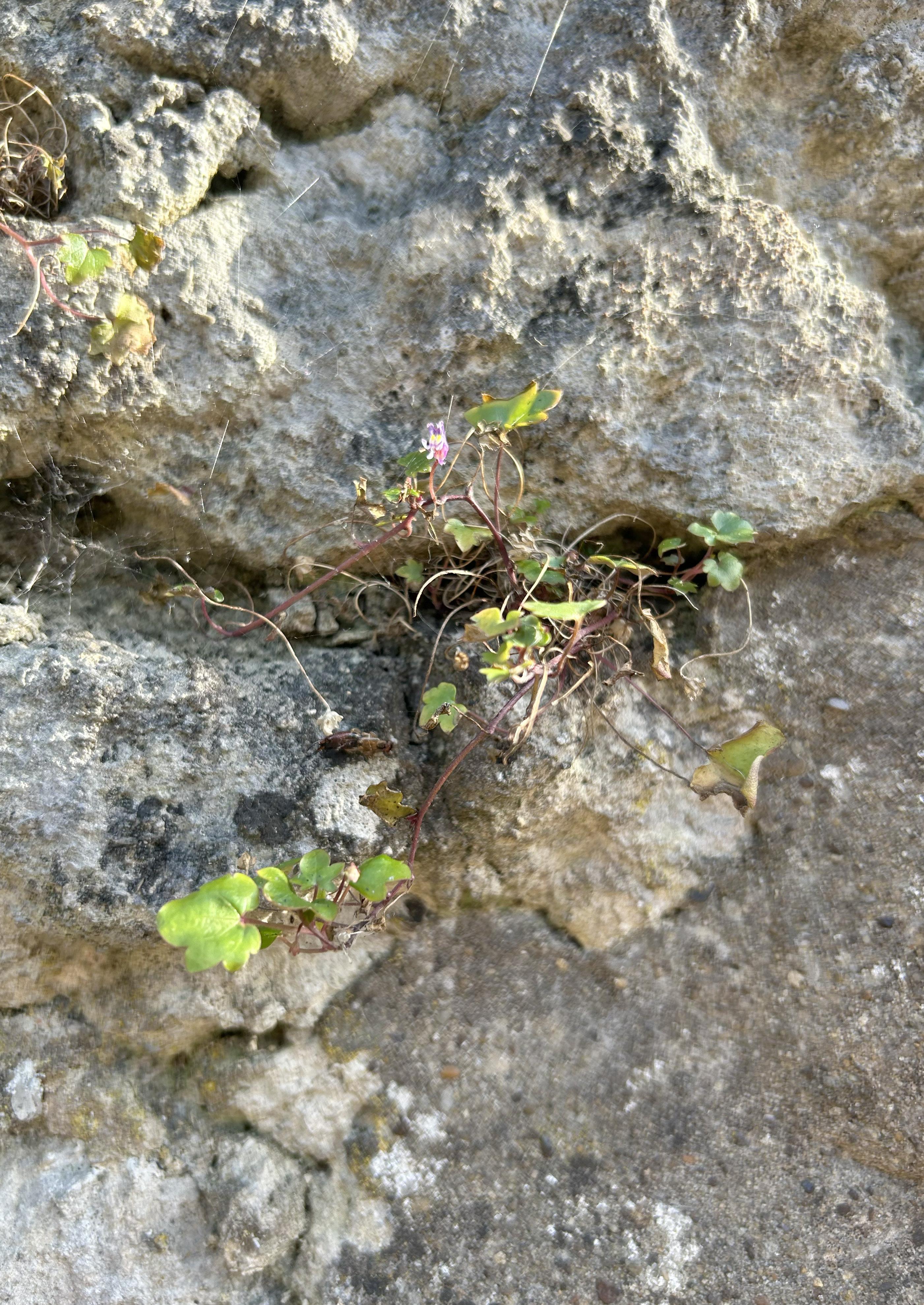 (Next page) [Fig. 3] Keinlworth ivy [Cymbalaria muralis] growing in the cracks of a weathered stone wall (Wilks, 2023)