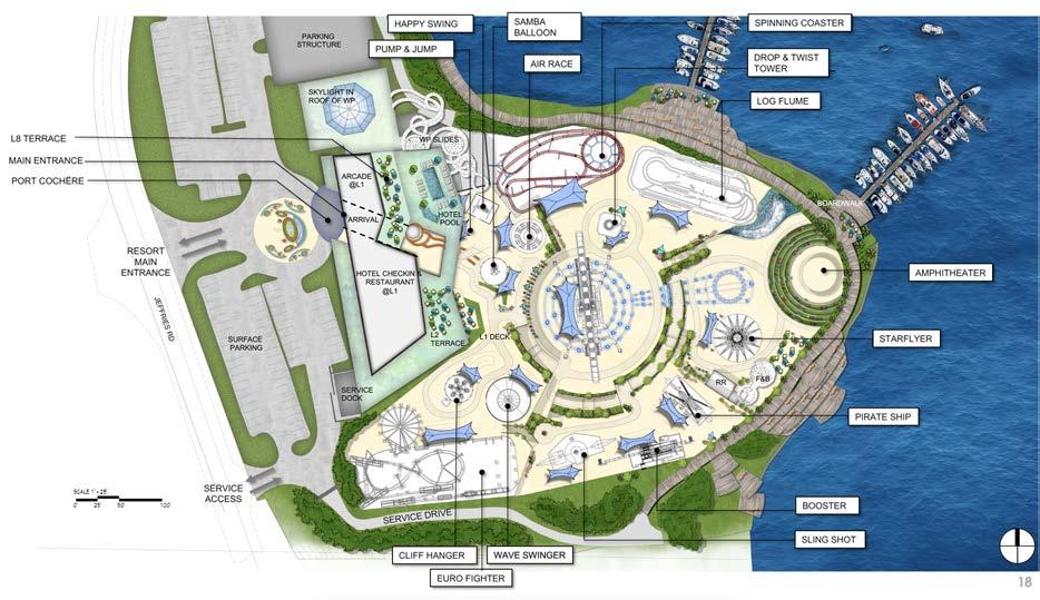 Program: Adventure park masterplan: two phases. Arcade, parking garage, multiple food/beverage areas, amphitheater, 14 rides/attractions, Observation wheel