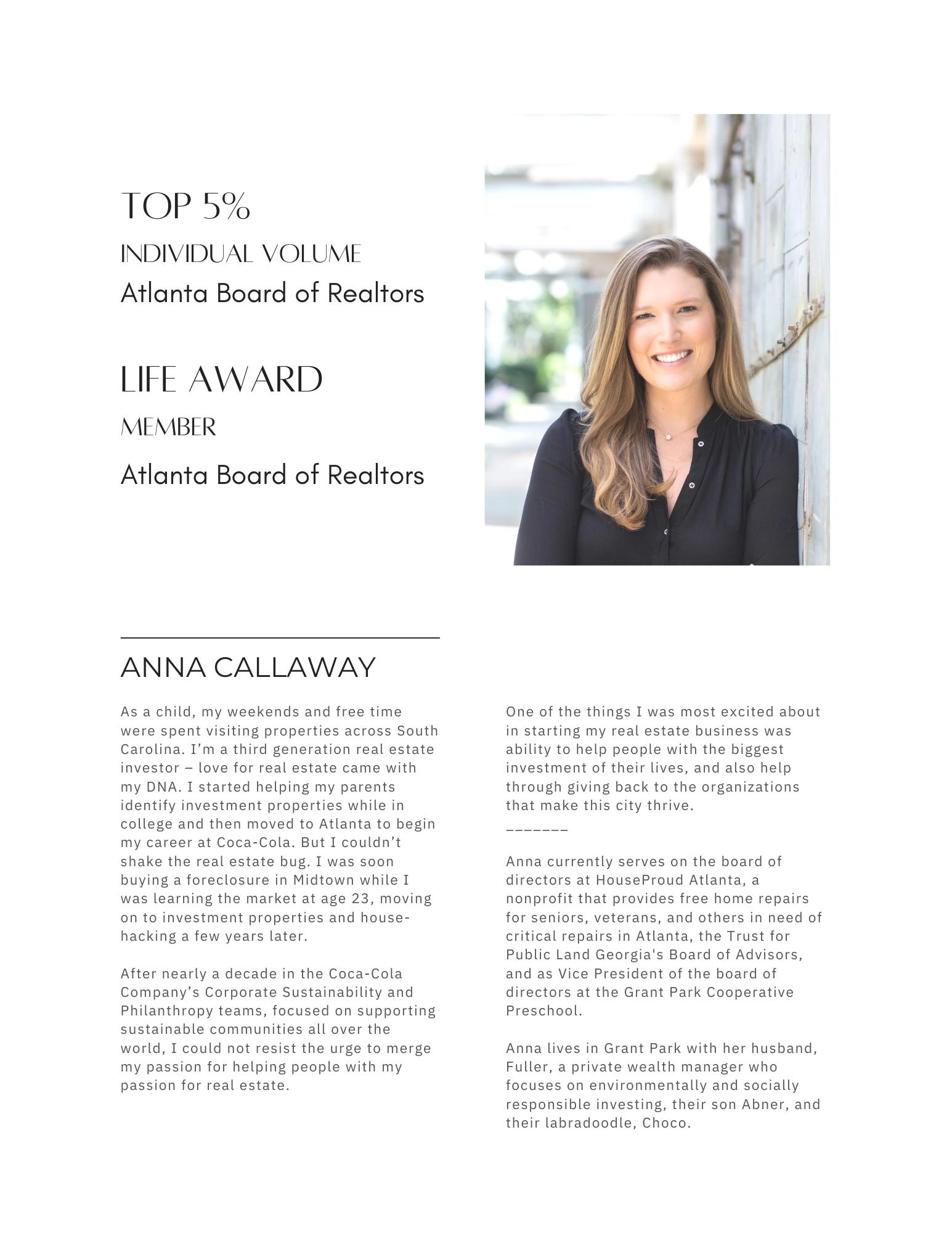 I highly recommend Anna Callaway for your real estate needs. She is very professional and adept at working with both sellers and buyers. Anna takes on her projects with thoroughness and enthusiasm. The end result is success. Anna has a very thorough knowledge of the Atlanta real estate market which enabled her to show us the inventory of homes which matched our very specific requirements and budget. Her research, energy and time was appreciated. After a week of working with the Seller's agent, we had a very amicable Closing.