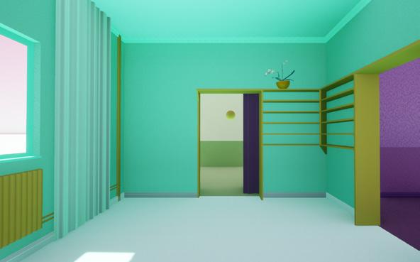 Detta rum har en kulör som samverkar nära rum D:s färgskala då det finns en framträdande siktlinje mellan rummen.