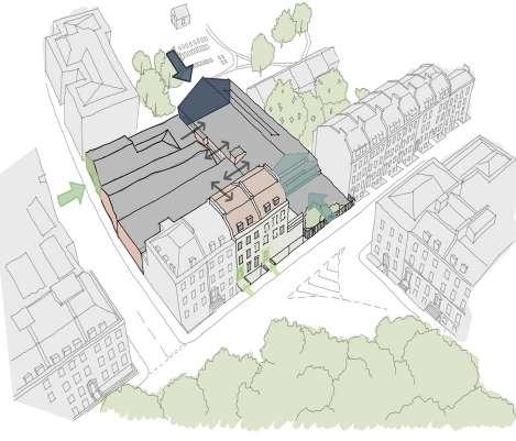 The approach of demolition is the proposed to divide the main building into two more maneagable blocks. Otherwise the demolition is limited by enhancing the repurposing approach in the whole scheme.