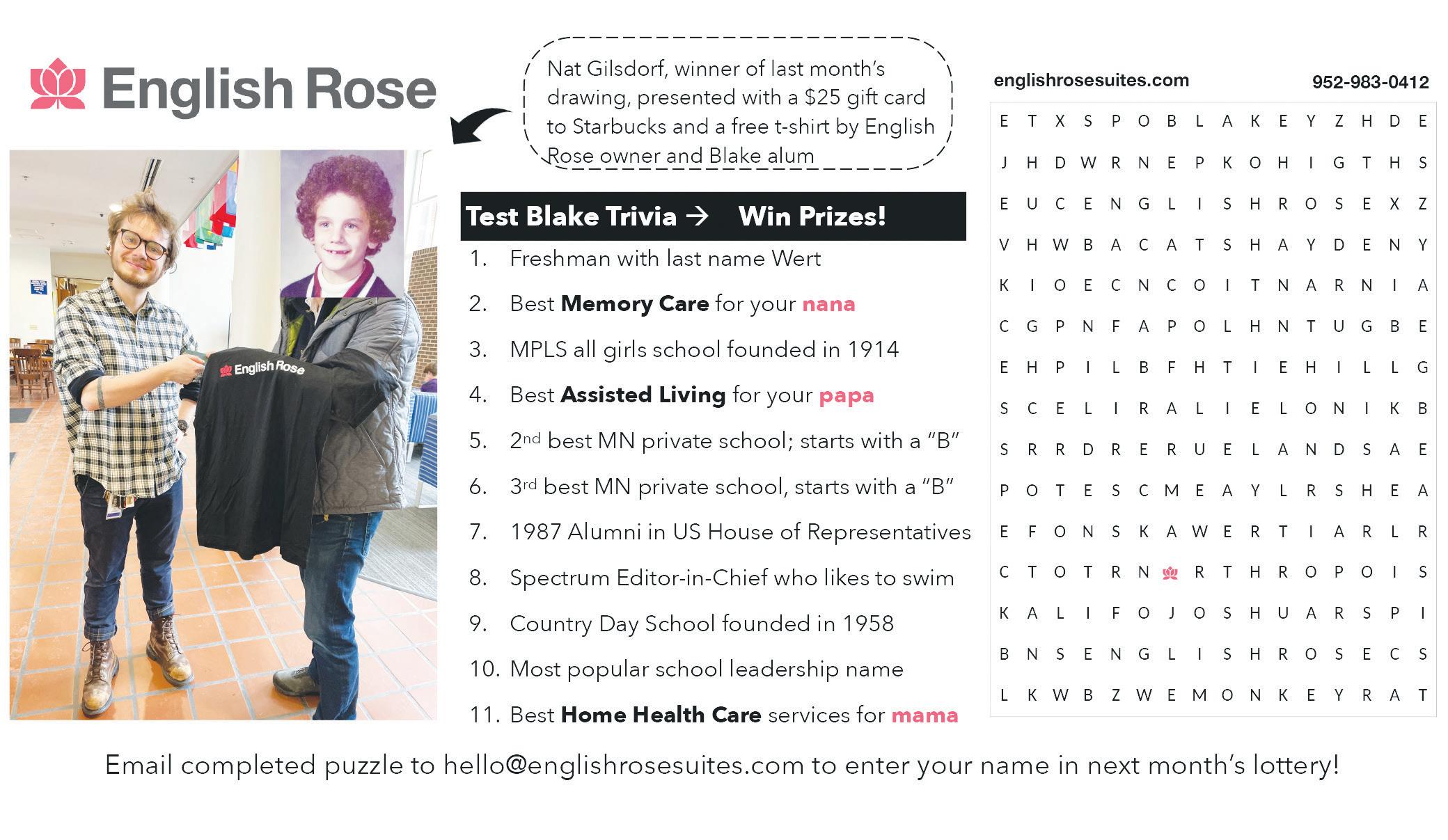 The primary purpose of the Blake School Spectrum is to report news and to explain its meaning and signifcance to our readers and the community. We hope to inform, entertain and provide a school forum for the unrestricted exchange of ideas and opinions.