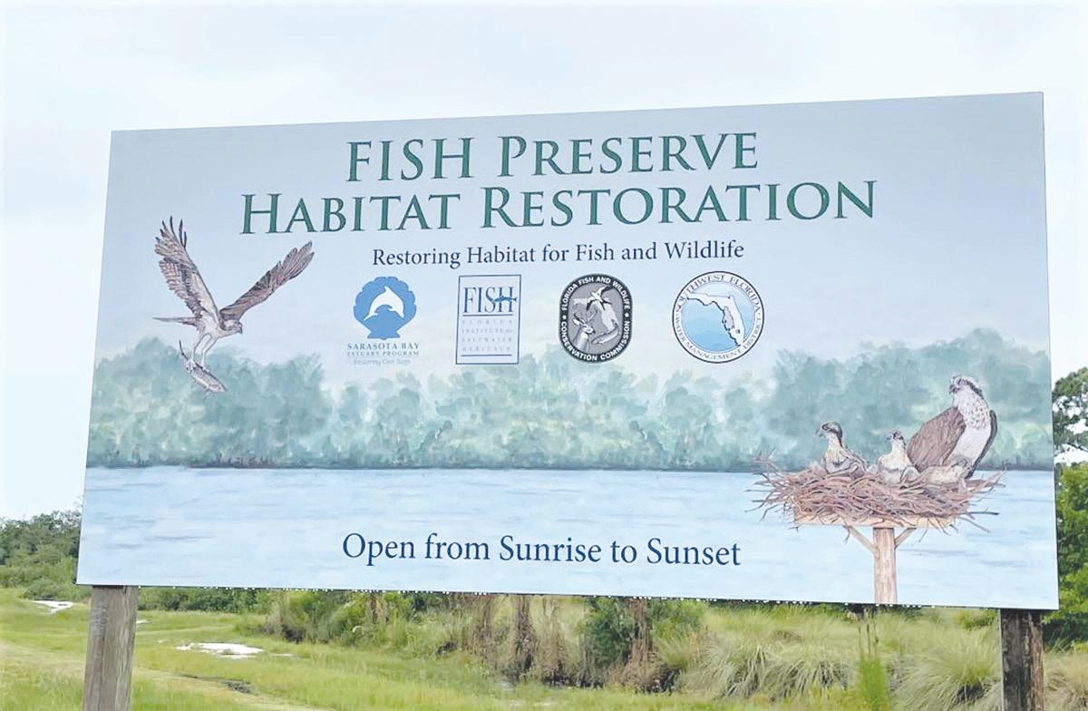LESLIE LAKE | SUN A new sign at the west end of the 100-acre FISH Preserve invites people to explore the habitat restoration project from sunrise to sunset. The annual Cortez Commercial Fishing Festival has raised the funds to purchase and restore the land piece by piece over several decades.