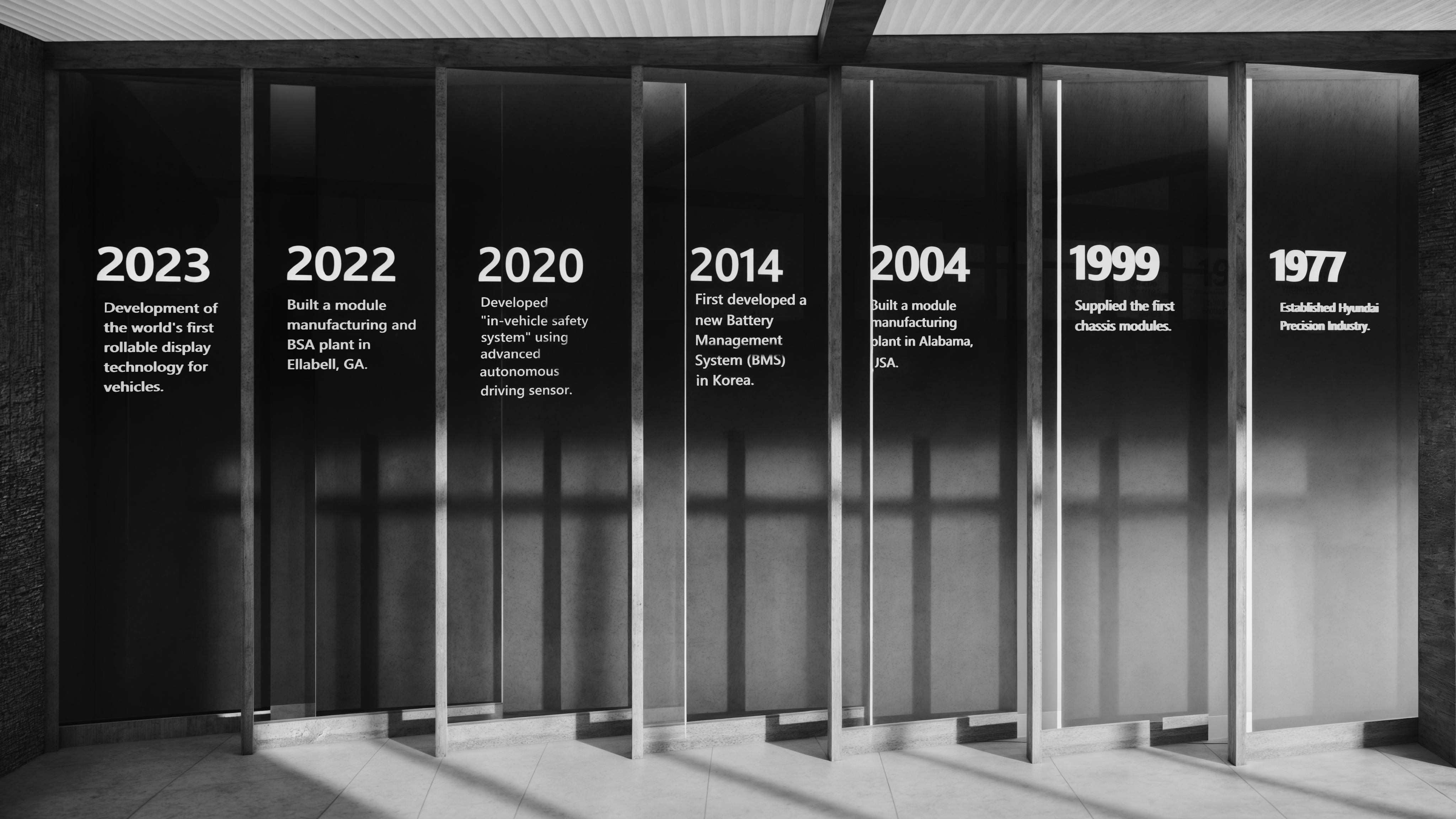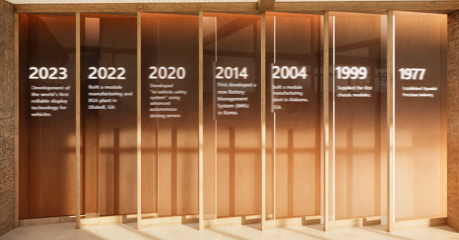 The window features a timeline of the company's achievements over the years, with translucent materials incorporated to showcase the progression in a visually dynamic way.