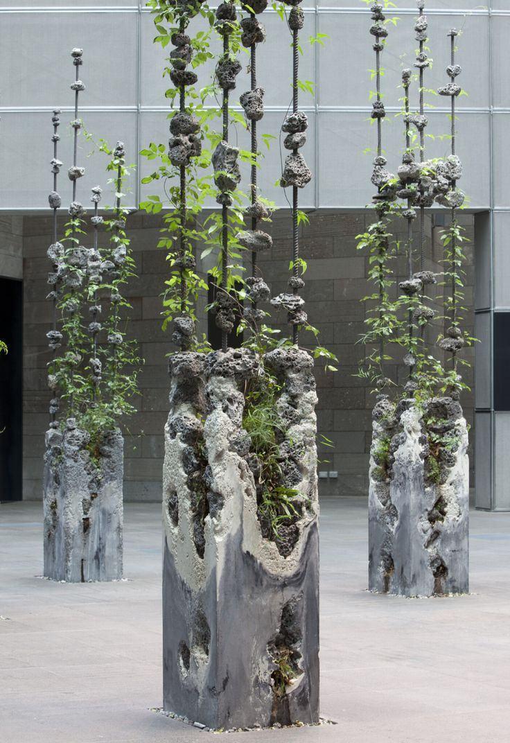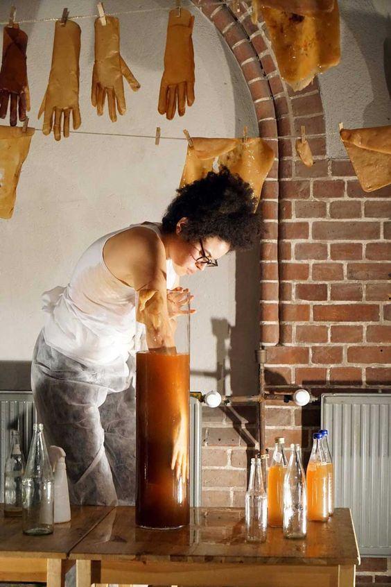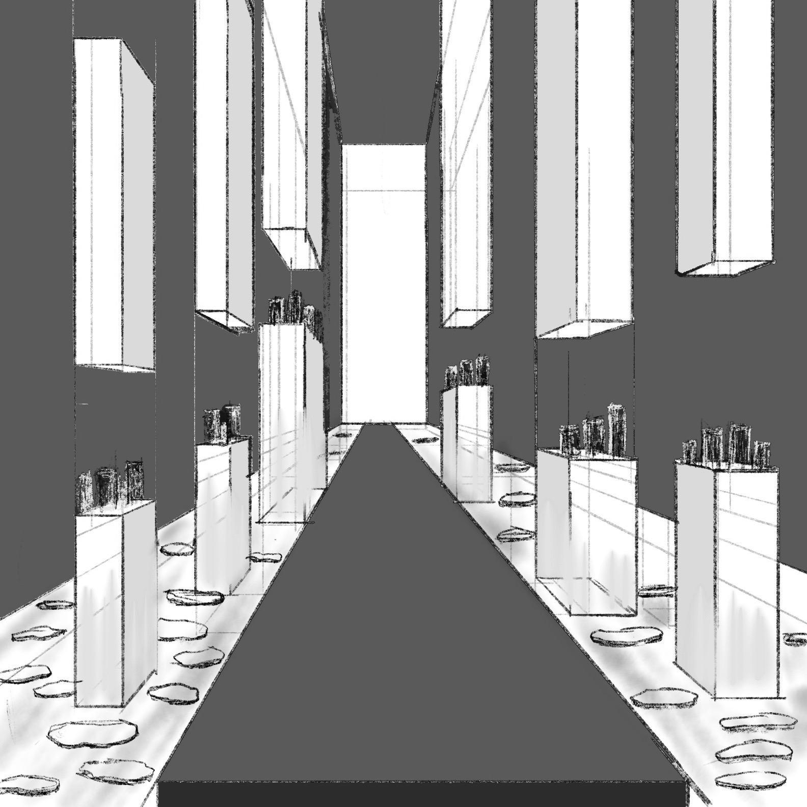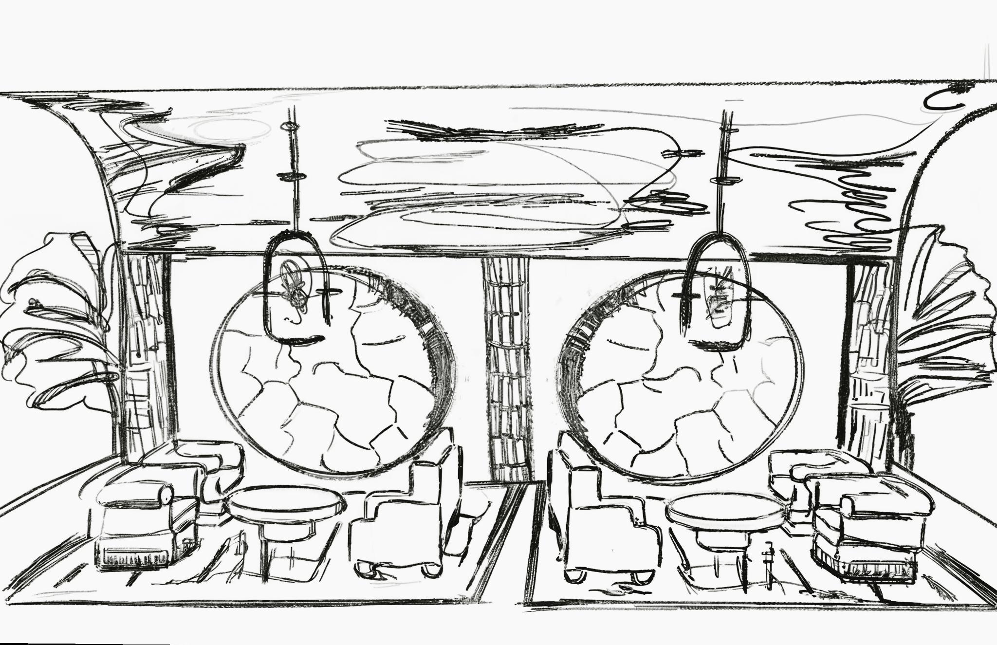The concept involves submerging columns in water to emulate the interior of a fermentation jar, resulting in an ethereal and otherworldly space.
