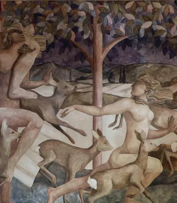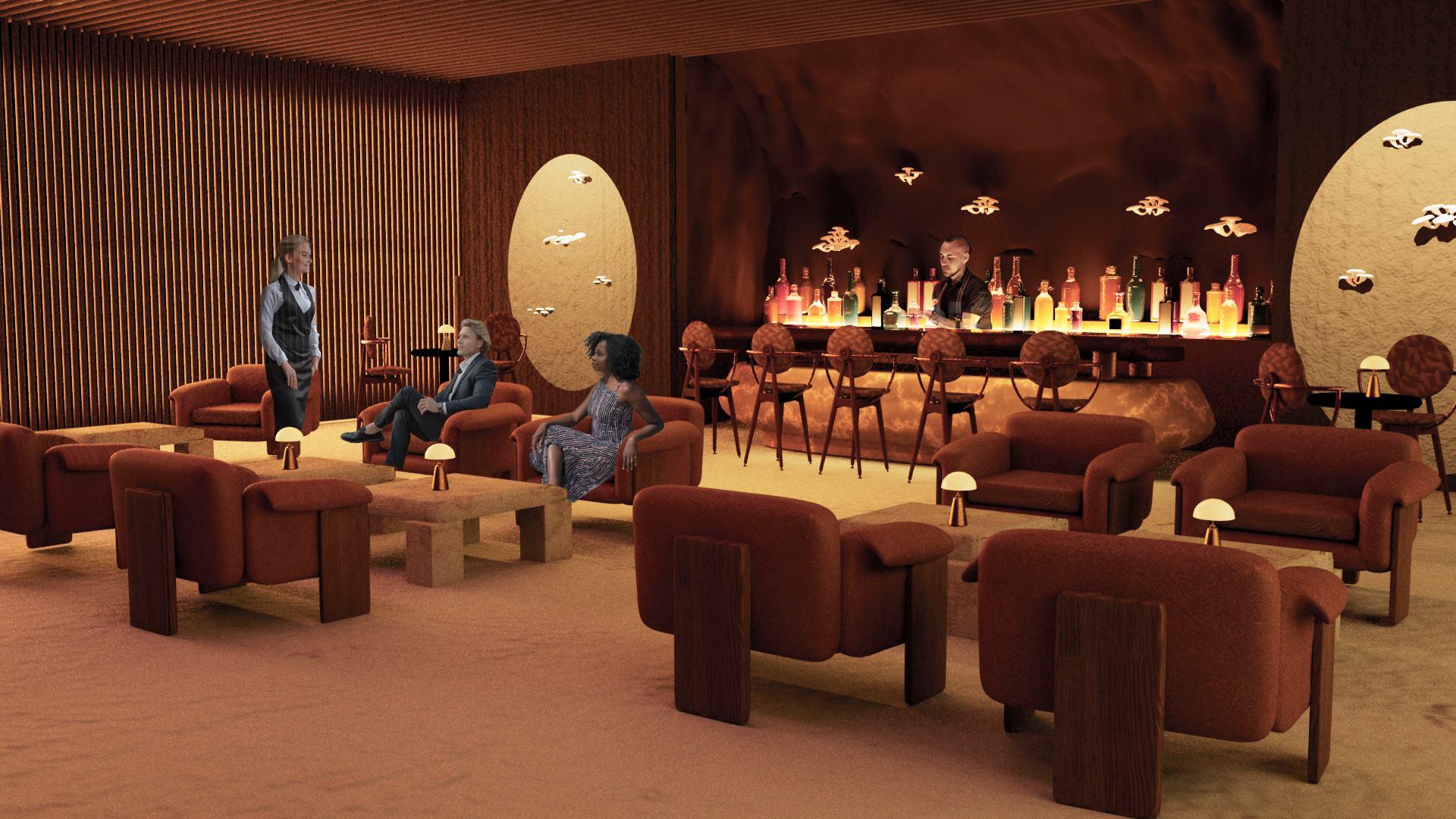 Stone and sand textures have been integrated throughout the space, adding textural intrigue and a connection to the Neolithic period that serves as the inspiration for this design.