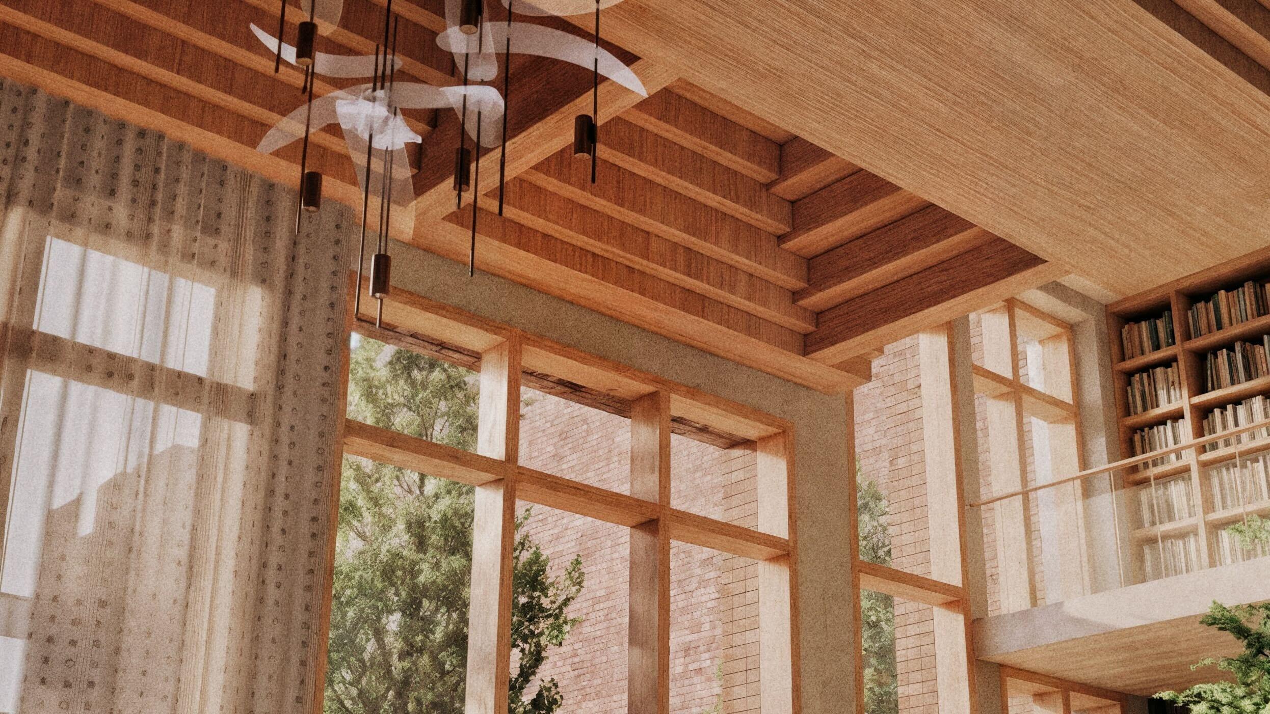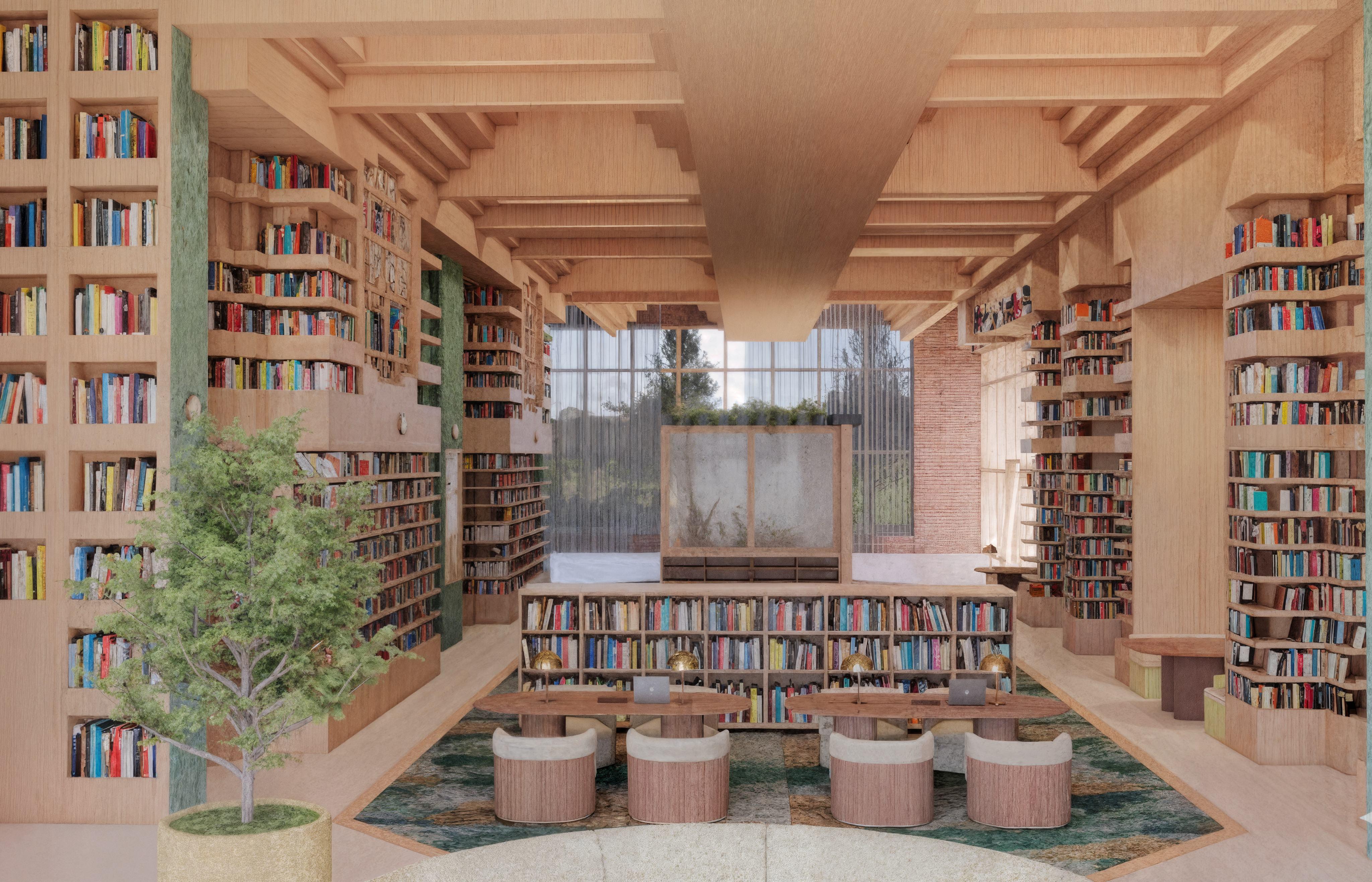 The central library features rows of bookshelves with various compartments for storage. The design aims to blend traditional molding with modern textures, creating a juxtaposition that fosters a familiar and welcoming environment for all generations.