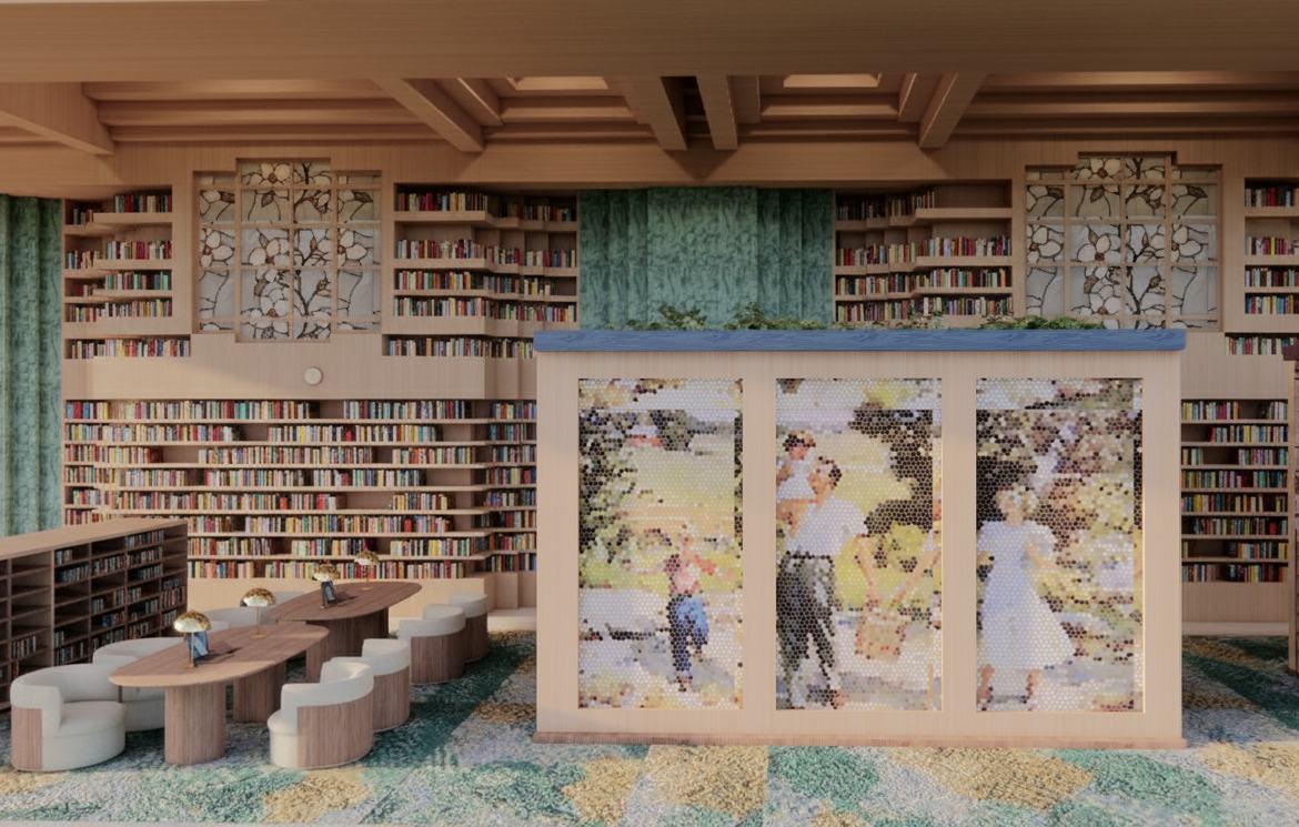 Mosaic art was utilized to craft a lifelike image that tells a story. This technique is integrated into the bookshelf design, symbolizing the stories within the books and inspiring visitors to explore the space together.