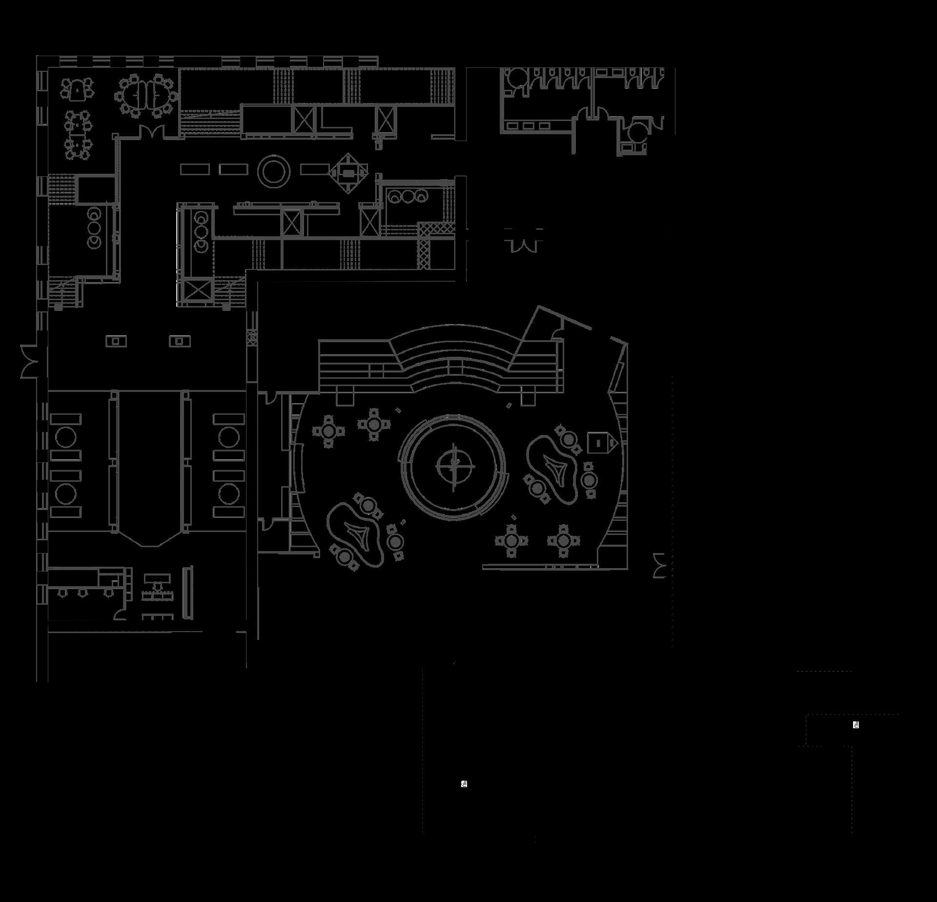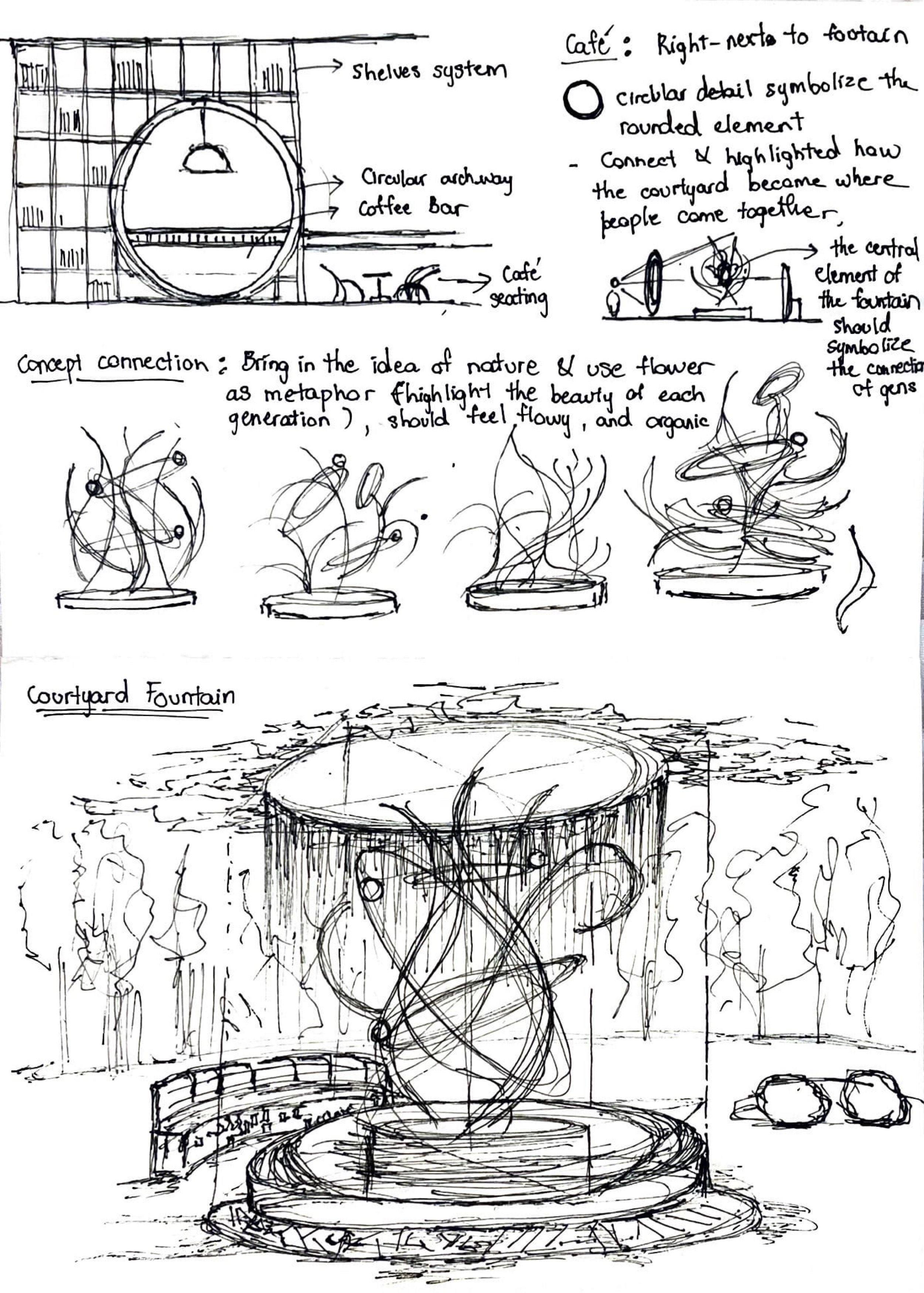 The fountain in the courtyard is designed to mimic the shapes and movements of flowers and trees in nature, symbolizing the library's core mission of flexibility and adaptability. This design reflects the library’s commitment to creating a dynamic space that evolves with the needs of its users, encouraging growth, change, and connection.