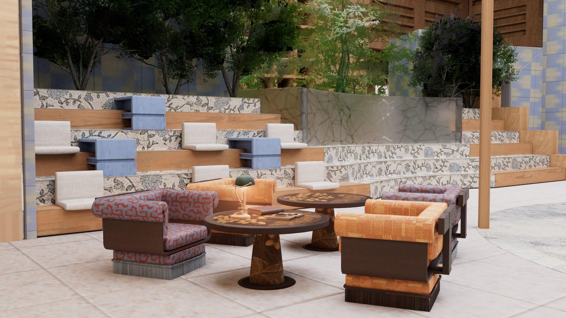 The outdoor sitting area is designed to evoke the essence of a garden, offering a tranquil and refreshing retreat. It features tiered stair seating with built-in tables, seamlessly integrating functionality with comfort