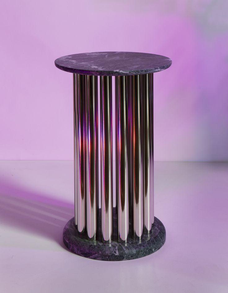 Traditional columns crafted from reflective materials create an intriguing blend of historical and futuristic, offering a juxtaposition that merges the past with modern.