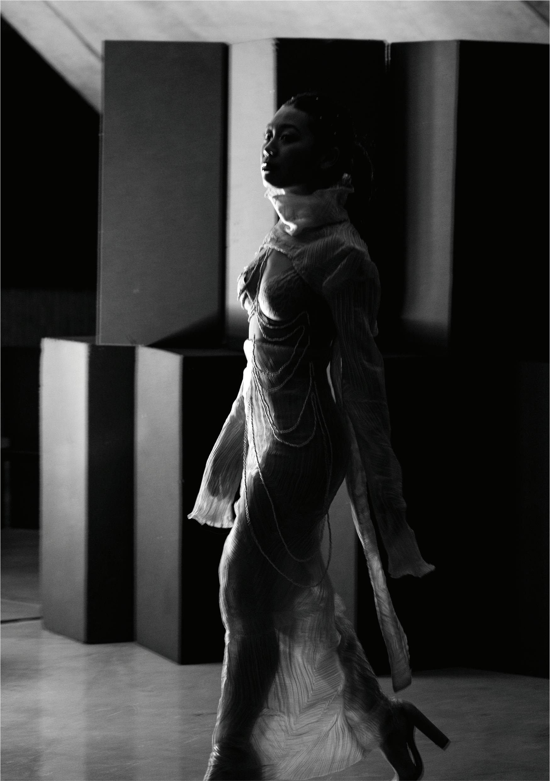 Inspired by the forms sculpted by millenia of interaction between water and stone, Erosion explores the duality of water as both an idyllic muse and omnipotent force. This collection contemplates humanity’s futile attempt to control its future when, just like rock, we will inevitably surrender and evolve under the current of the macrocosm. Fabric and form manipulate the boundaries between rigidity and fluidity, depicting the erosion and transformation of nature and humanity alike. Let the topographies around us stand as a humble reminder of the beauty in relinquishing control and embracing the inherent ebb and flow of existence. alraqapparel.com / @altraqapparel