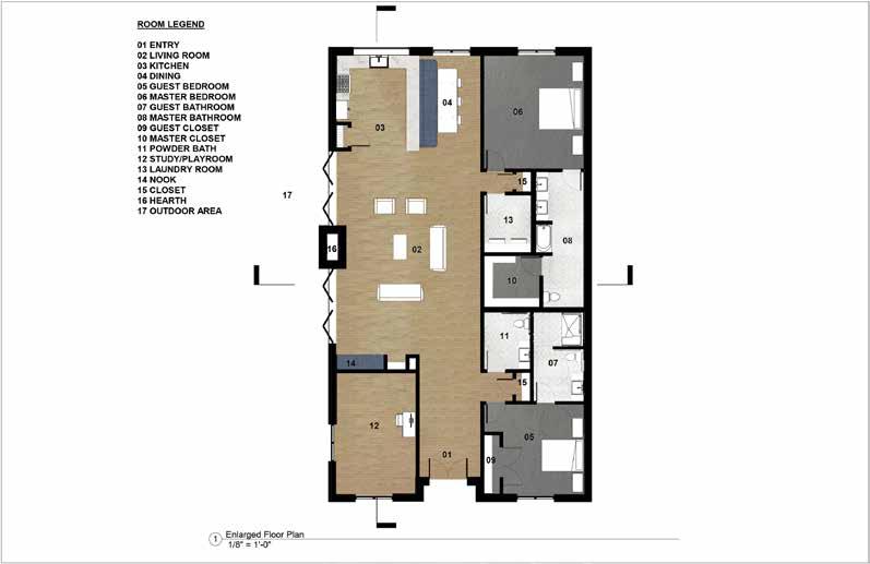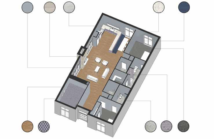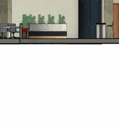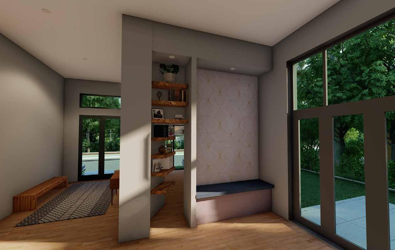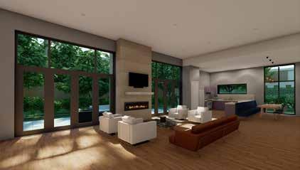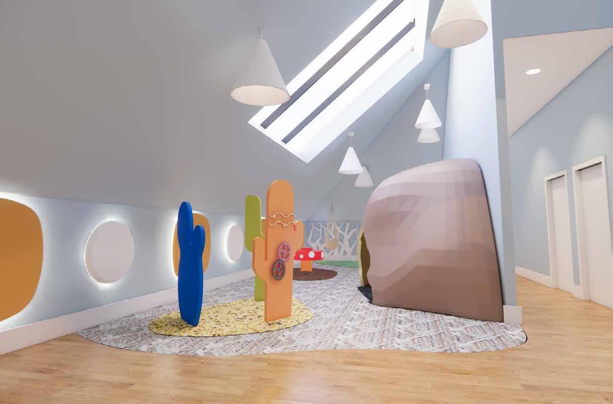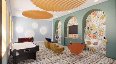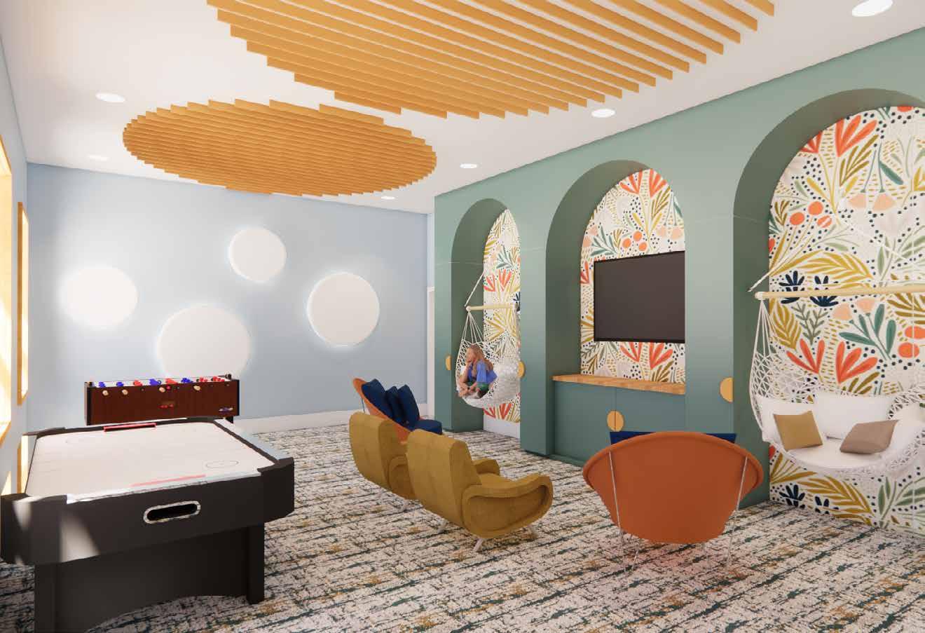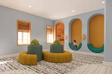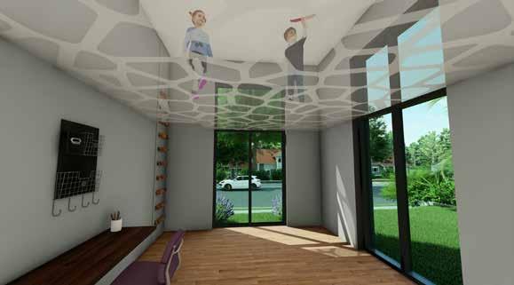The Lilac Garden’s use of colors and materials along with natural light help create an elegant and calming space for the families. The space includes a through wall fireplace in the hearth and bi-folding doors to promote an indoor / outdoor atmosphere. The homes are designed with a built-in nook that has built in shelving and custom seating. The built in shelving disguises a secret hidden door that leads to the playroom / office. This spaces uses a suspended netting system to create a special environment for children with Autism Spectrum Disorder (ASD) where sensory stimulation and physical activity are very important. This space gives ASD children their own space to move around or to unwind.