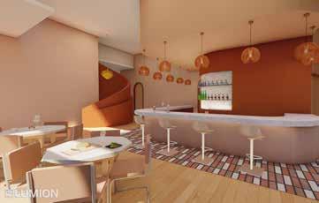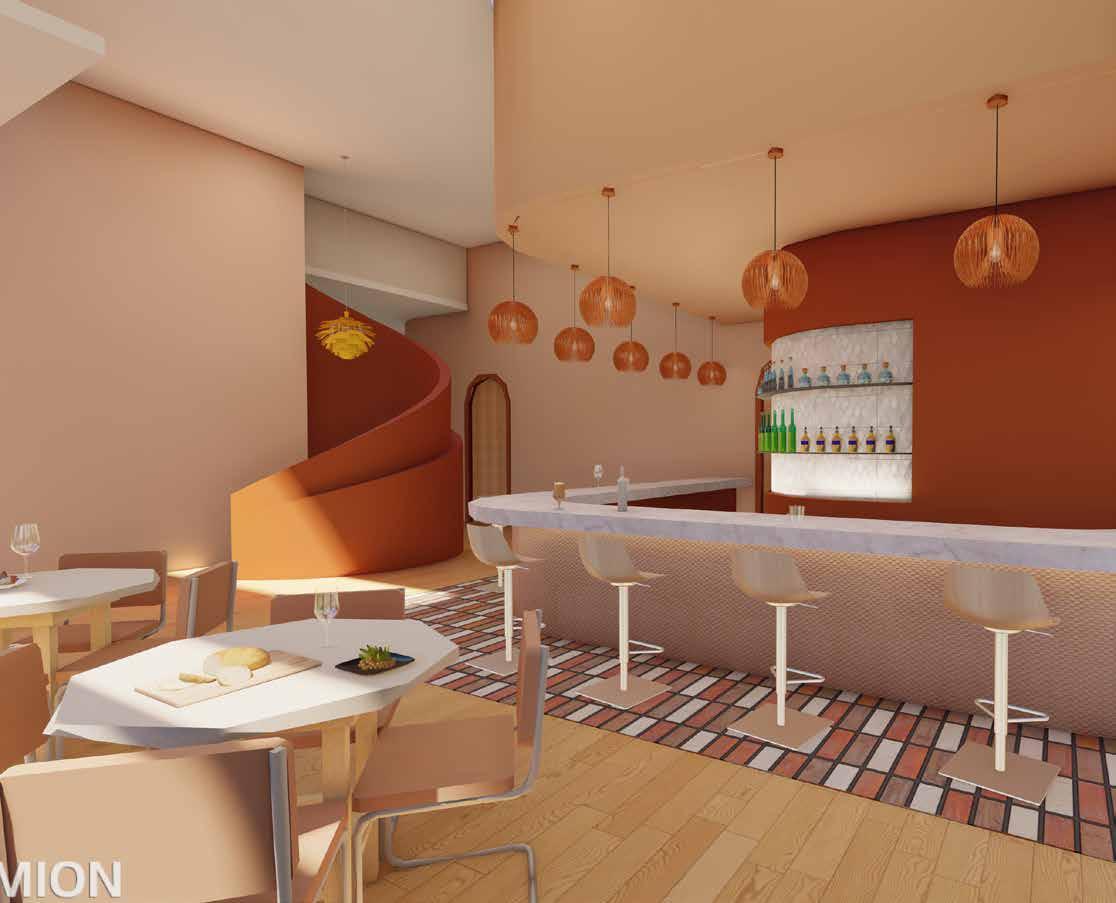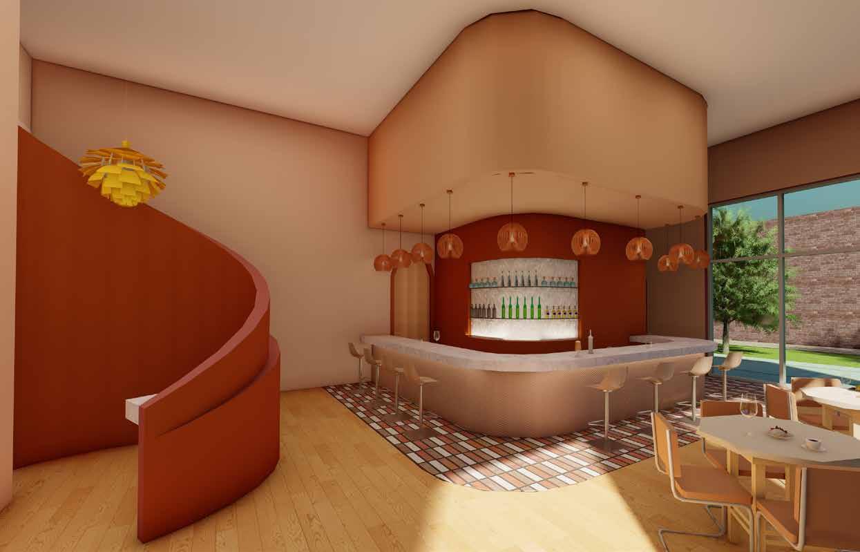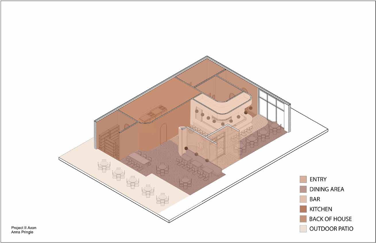 The design for the restaurant comes from the concept of a blooming flower. The flower concept translates throughout the space which is influencing the curved walls, rounded light fixtures, rounded tables, and curved flooring patterns. The primary design feature of the room is the double curved and angled wall that is acting as a flower that is opening up and engulfing the hostess stand. The warm monochromatic color scheme is meant to represent the warmness of spring as flowers begin to bloom.