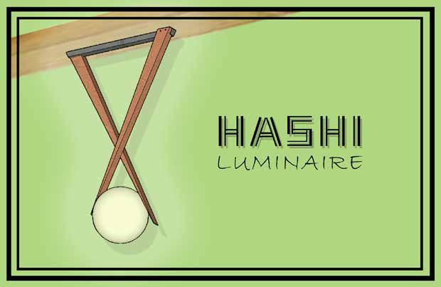 These four sheets were submitted to the Robbert Bruce Thompson annual student light fixture design competition. Hashi is a luminaire designed for sushi or Asian restaurant and can be installed in interior or exterior spaces. The concept for this luminaire comes from a pair of chopsticks holding a sushi roll. The illuminated globe provides diffused lighting above dining tables. The word “hashi” means chopsticks in Japanese. The luminaire is constructed from recycled pine wood and sustainable plant polymer. The light is illuminated by an LED bulb that is housed within the globe and connects to the ceiling or beam through a track mounting system.