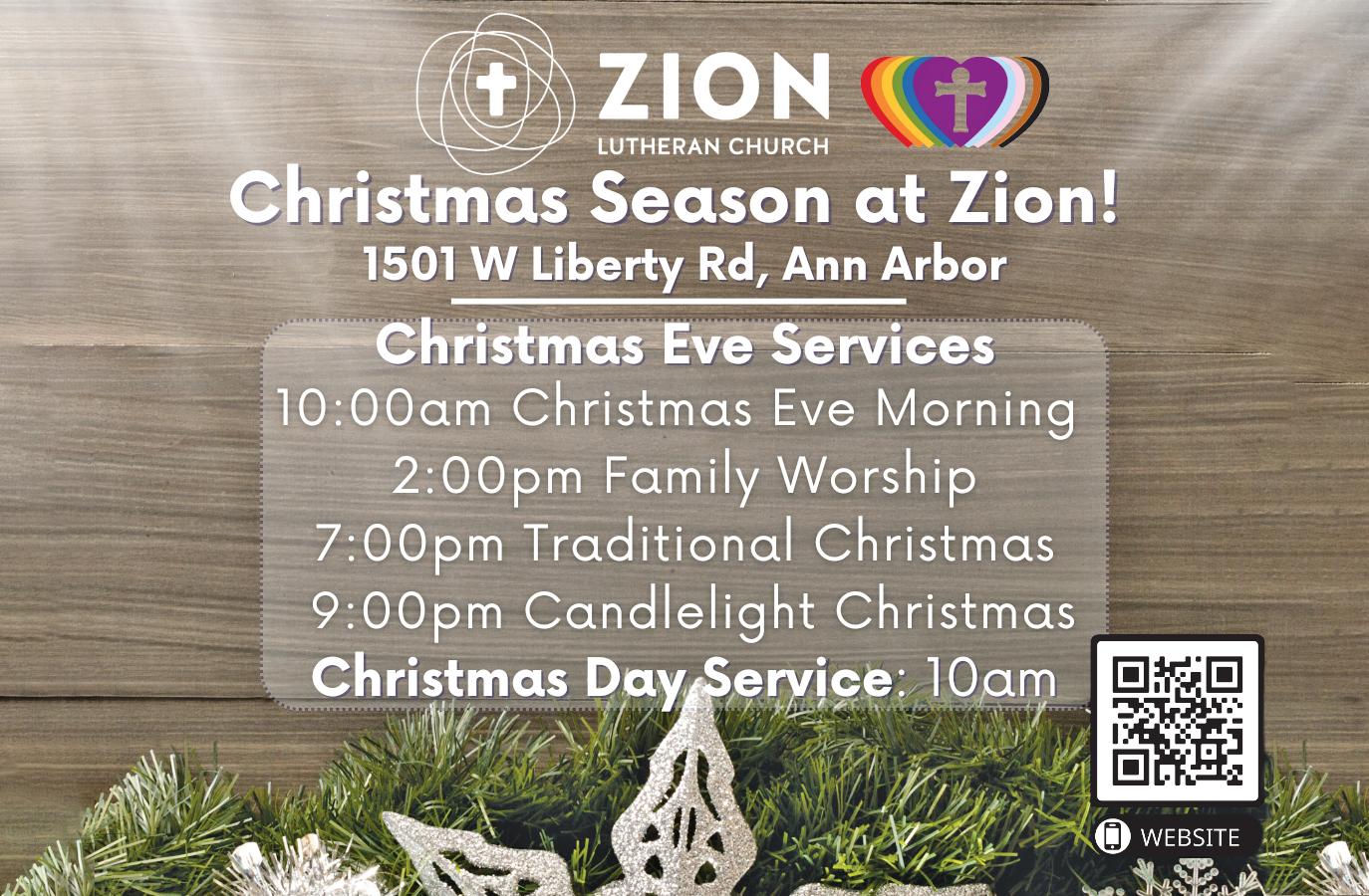 All are welcome to celebrate this Christmas season at Zion Lutheran Church! Holiday services include Christmas Eve services at 10 a.m., 2 p.m., 7 p.m., and 9 p.m., and Christmas Day service at 10 a.m. Zion seeks to boldly practice the way of Jesus, and encourages you to come as you are. Celebrating 150 years, Zion Lutheran Church is continuing to celebrate God’s truth, gifts of faith, hope, love, and grace.
