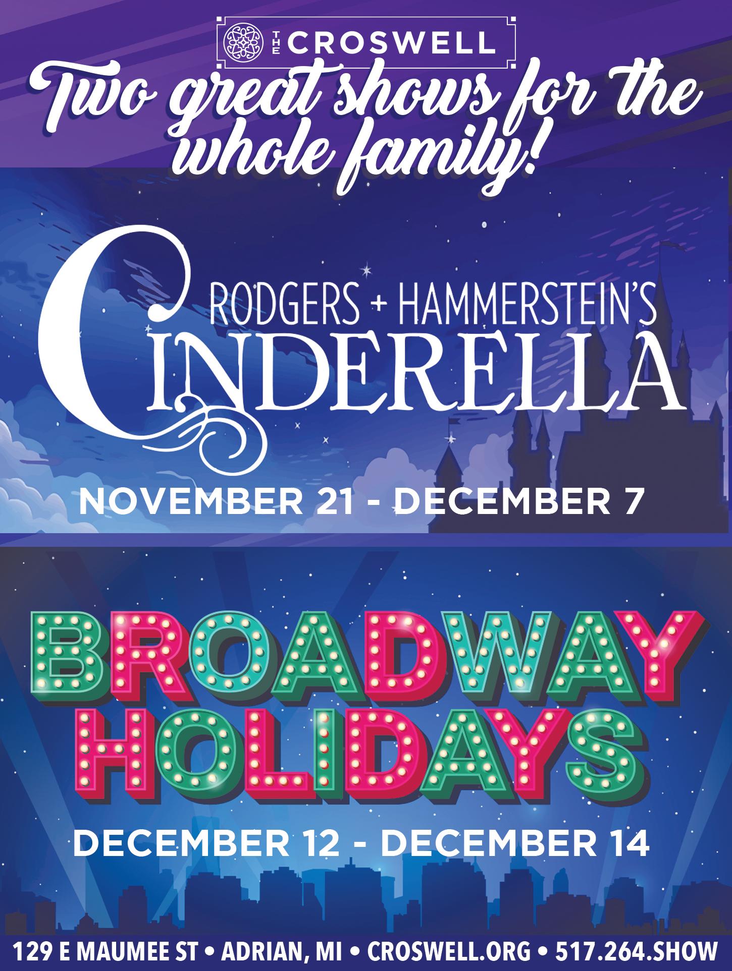 The Croswell Opera House has two great shows for the holidays! Rodgers and Hammerstein’s Cinderella is a contemporary take on the classic tale featuring new characters, a hilarious script, and an unforgettable score. It’s a magical start to the holiday season! Also in December—Broadway Holidays will become one of your most loved traditions! Join some of your favorite stars from recent Croswell shows for this fun-filled, family-friendly musical extravaganza, featuring a mix of Christmastime classics and Broadway hits that will leave you with a song in your heart.