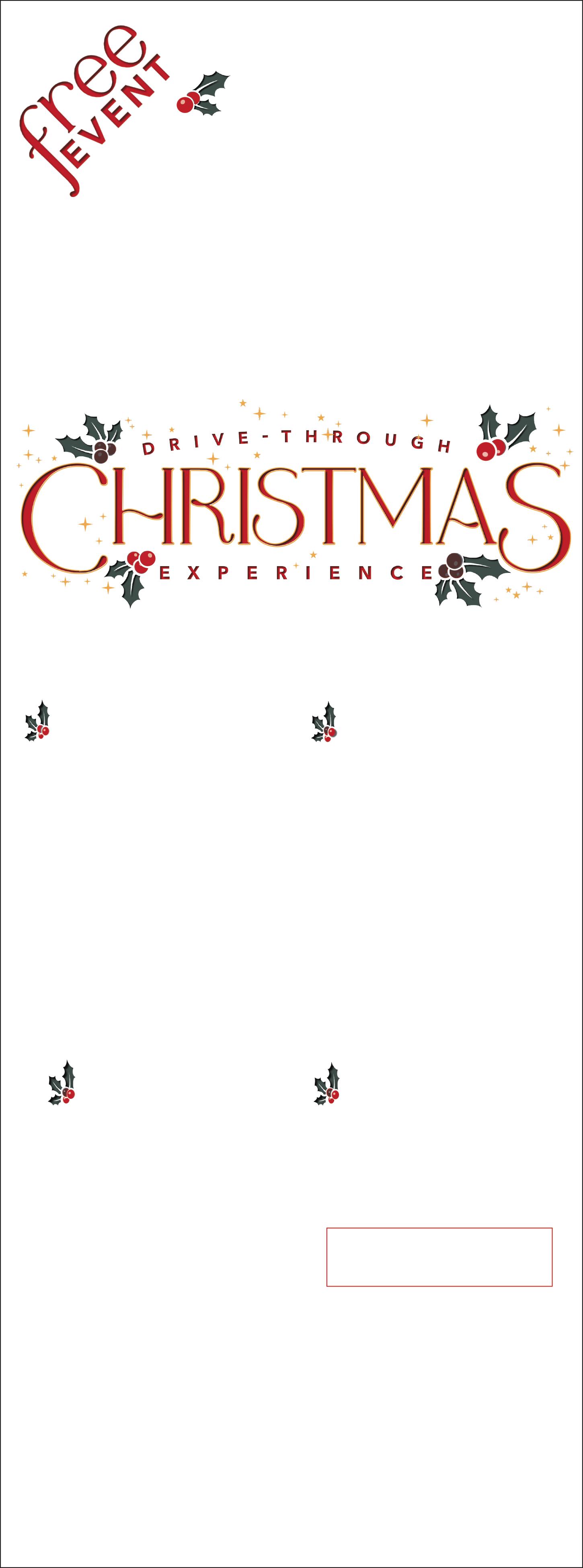 All are welcome to drive through their 50,000+ light show featuring lit trees, drive-through tunnel, live nativity, and decorated building. Enjoy a free cookie and hot chocolate on your way to a mini movie showing on their 16-foot screen. This is a completely free event! Total experience time is 20–30