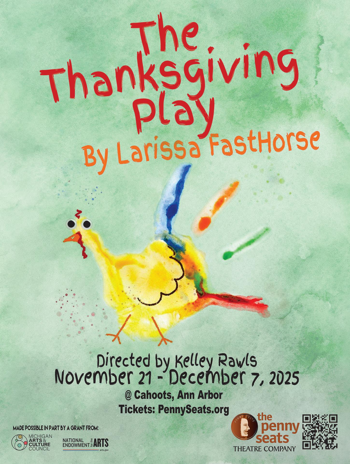 The Penny Seats Theatre Company proudly presents The Thanksgiving Play, by Larissa FastHorse, playing at Cahoots Event Center in downtown Ann Arbor, November 21–December 7. Good intentions collide with absurd assumptions in this wickedly funny satire, as a troupe of terminally “woke” teaching artists scrambles to create a pageant that somehow manages to celebrate both Turkey Day and Native American Heritage Month.
