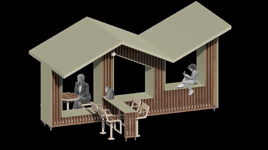 The designs account for both children and adults and provide opportunities for sitting inside, using them as dining tables, market counters, or bar counters. Bicycle parking is also incorporated under the roofcovered modular furniture.