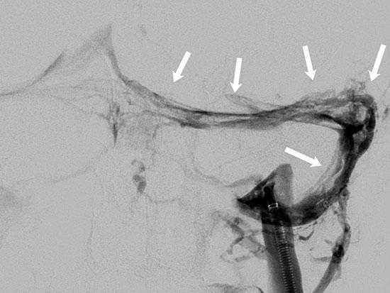 The arrows indicate scattered blood clots present throughout the venous system, which were diminished in size and extent after treatment.Fisher initially treated Thomas’ blood clots with blood thinners, hydration and pain