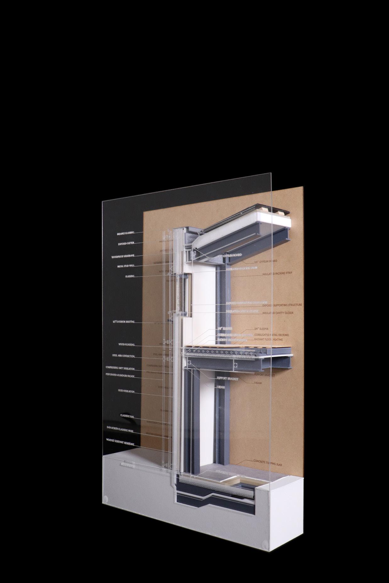 13 I-BEAM METAL STUD RAIN-SCREEN CLADDING PANEL PARAPET FLASHING PERFORATED ALUMINUM FACADE EXPOSED GUTTER OPERABLE WINDOW FRAME FLASHING WOOD FLOORING SLEEPERS RADIANT FLOORING CORRUGATED METAL DECKING GYPSUM CEILING CONCRETE FLOORING RIGID INSULATION SUPPORT BRACKET SHEETING