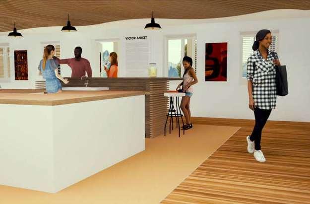 Le café philo est le point culminant de rassemblement. Pour le mettre en valeur, un aménagement qui reprend les codes de la maison créole a été créé, c’est-à-dire la prise en compte de façades libres et de la coursive. Les visiteurs découvrent dans les extrémités de l’espace, un couloir faisant office de salle d’exposition, qui permettra aux jeunes talents d’immerger et de se faire connaître assez rapidement, grâce à