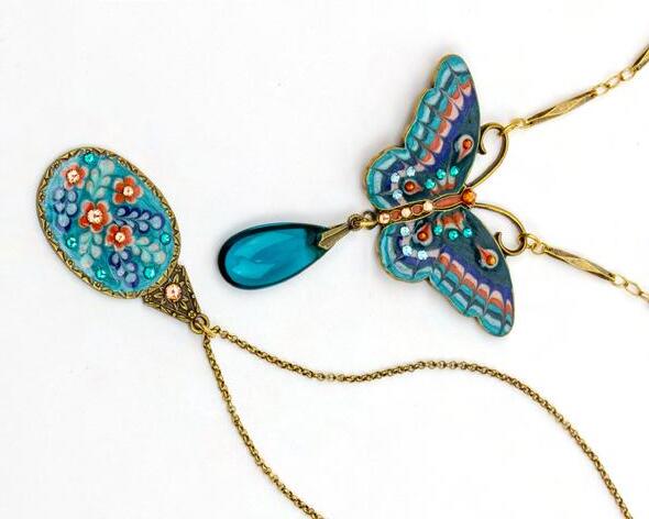 We pride ourselves on handcrafting our jewelry with time-tested techniques that no foreign assembly line or machine can match. Our work endures because we use only the fnest materials; brilliant crystals, freshwater pearls, hand mixed and hand applied enamels, antique glass beads, reproduction glass stones, Mother of Pearl, etc. Chains and clasps are solid brass. Most importantly, all fndings are lead/nickel/cadmium-free.
