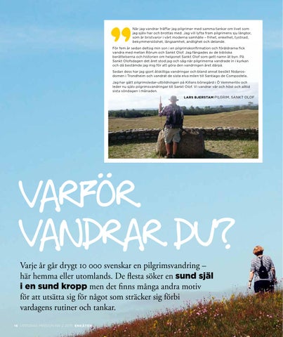 Varför vandrar du? Varje år går drygt 10 000 svenskar en pilgrimsvandring – här hemma eller utomlands. De flesta söker en sund själ i en sund kropp men det finns många andra motiv för att utsätta sig för något som sträcker sig förbi vardagens rutiner och tankar. 16 UPPDRAG MISSION NR 2 2015: ENKÄTEN