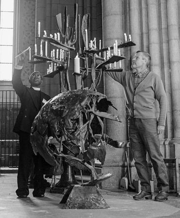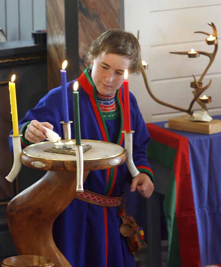 Adam Frisell tänder ljus i ljusbäraren vid sin konfirmation i Vallbo kapell nära Vålådalen 2009. Ljusbäraren är gjord av den samiske slöjdaren Folke Fjellström i Vålådalen, och ett av de material han har använt är renhorn.