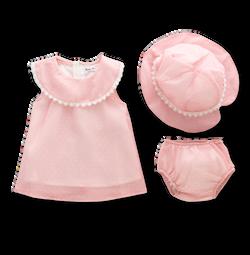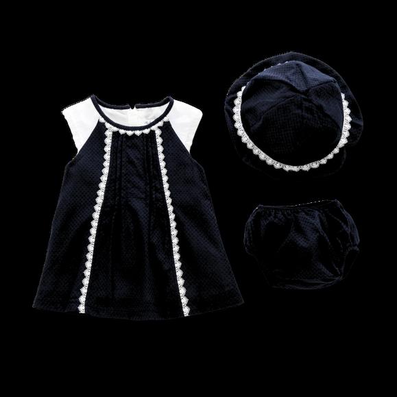 Pintucked graceful dress with contrast ranglan cap sleeve with co-ordinating lace trimmed sunhat and underpants. The dress is lined for comfort finish.