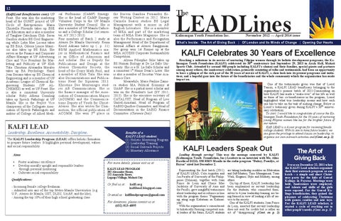 The Art of Giving Back It was on December 22, 2011 when the KALFI Lead scholars organized their first outreach program as one batch – a simple and short Christmas party for the kids of Gawad Kalinga in Payatas. Meetings were held, fundraisers were employed, and talents and skills of the girls were exposed. For the Gawad Kalinga beneficiaries, they gained the pleasure of celebrating Christmas with games, candies and new toys. For the KALFI LEAD scholars, it started a cycle of reaching out to other people’s needs. (Cont. on p. 3)