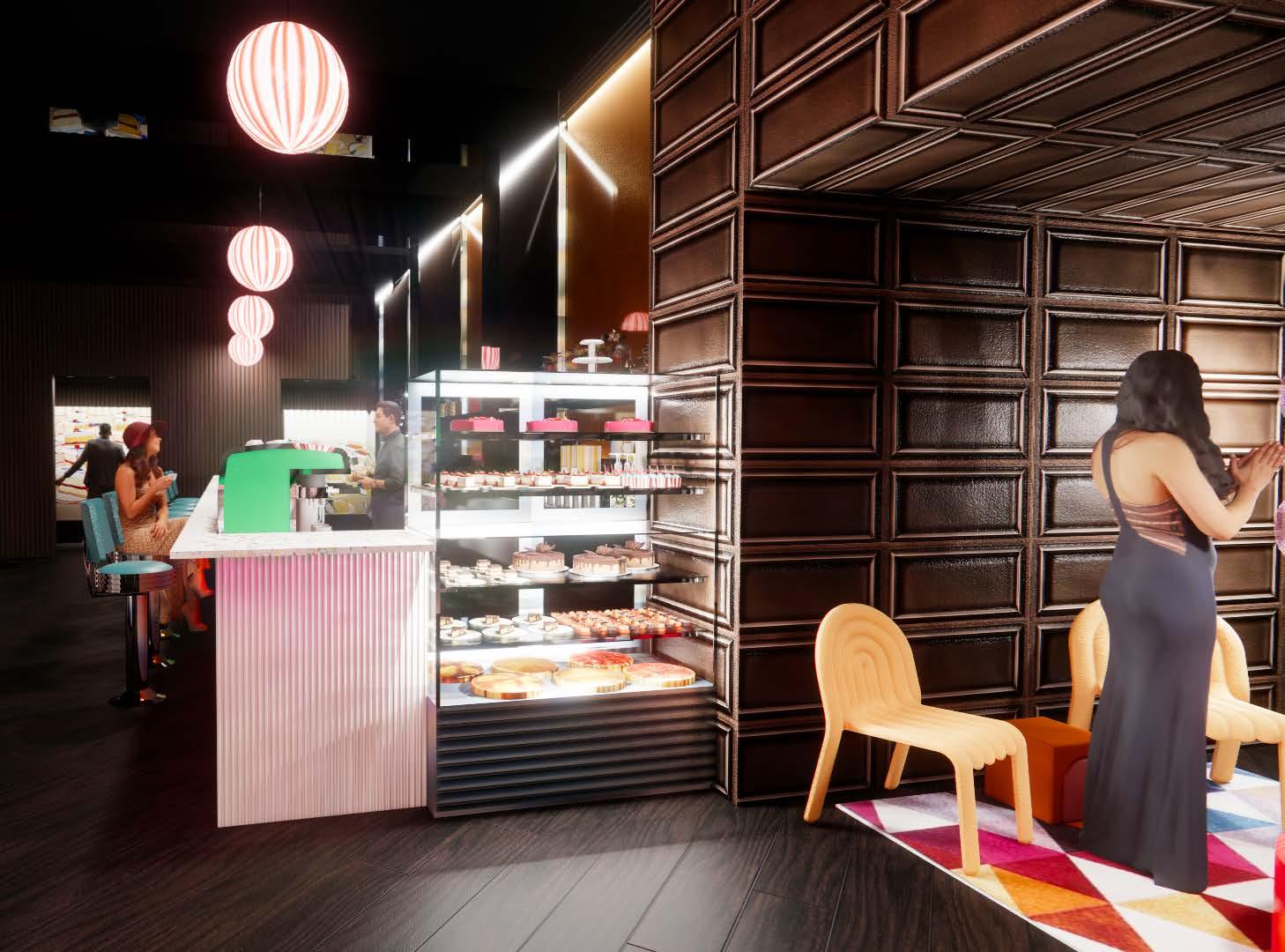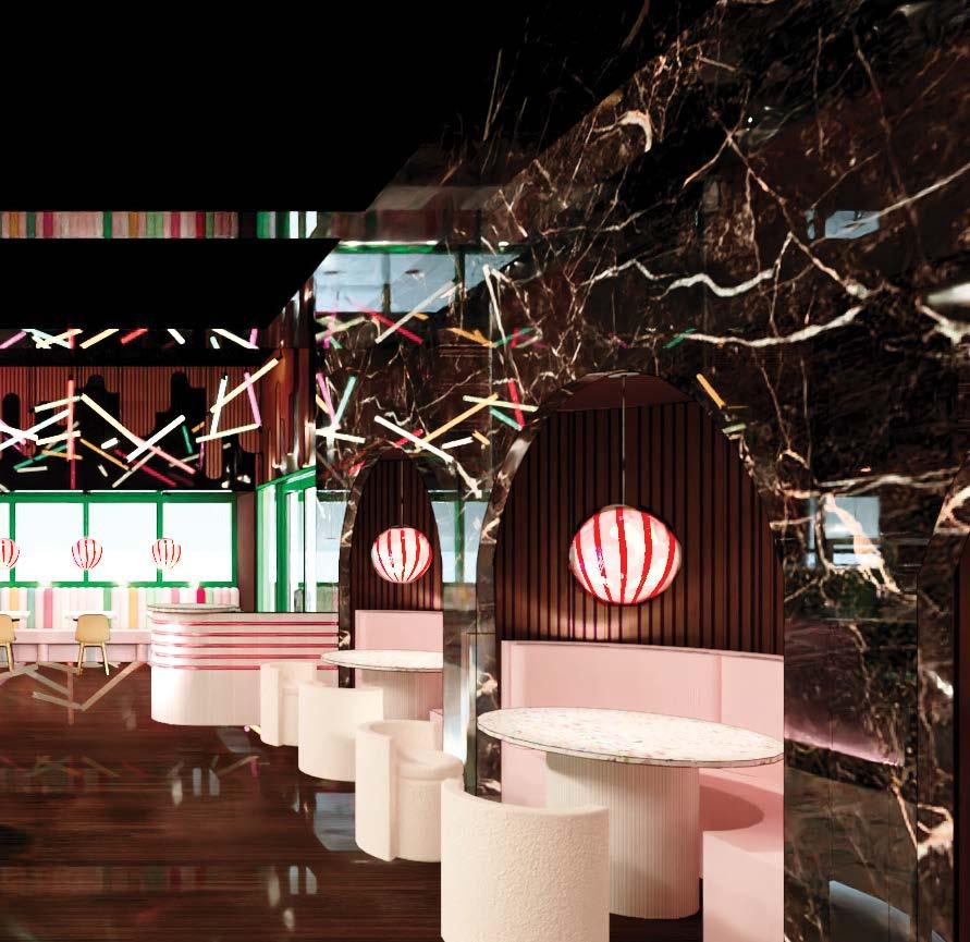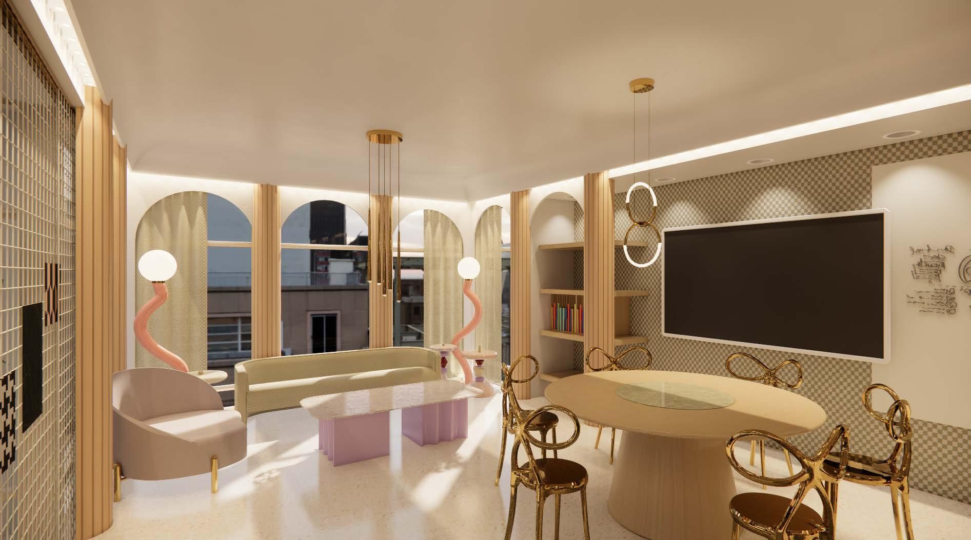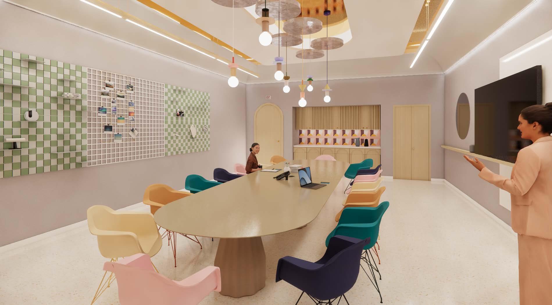 Office and conference room designs for a handmade jewelry and accessories company in London. Wolf and Moon is woman-owned and specializes in recycled acrylic and gold jewelry with playful themes and pop art and post-modern influences.