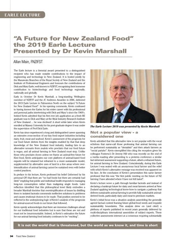 “A Future for New Zealand Food” the 2019 Earle Lecture Presented by Dr Kevin Marshall Allan Main, FNZIFST The Earle lecture is a biennial award presented to a distinguished recipient who has made notable contributions to the impact of engineering and technology in New Zealand. It is hosted jointly by the Manawatu Branches of the Royal Society of New Zealand and the Institute of Professional Engineers and honours the contributions of Dick and Mary Earle, well-known to NZIFST, recognising their immense contribution to biotechnology and food technology regionally, nationally and globally. Early in October Dr Kevin Marshall, a long-standing Wellington member of NZIFST and the JC Andrews Awardee in 2006, delivered the 2019 Earle Lecture in Palmerston North on the subject “A Future for New Zealand Food”. In his opening comments, Kevin confessed to having known the Earles for his entire career with his professional and personal paths intertwining with Dick and Mary’s since the 1960’s. Indeed Kevin admitted that his first ever job application as a fresh BE graduate was to Dick and Mary at the Meat Industry Research Institute of New Zealand ... he was declined! A short while later when Kevin enrolled at Massey University for his post-graduate degree it was under the supervision of Prof Dick Earle. Kevin has since experienced a long and distinguished career spanning an extensive cross-section of our key food export industries including dairy, fruit, meat and seafood. Kevin’s assessment of the prognosis for our food future derives from the insights enabled by that that deep knowledge of the New Zealand food industry, leading him to an alternative scenario from zealots who proclaim that our food future is vegan, and all animal farming in New Zealand must stop. Unlike those who proclaim doom unless we frame an animal-free future for Kiwi food, Kevin anticipates our core platform of animal-based food exports will be retained but reframed to a more sustainable model, supplemented by alternative uses of land in a few areas where overintensification of animal farming cannot be sustained even with better control practices. In preface to his lecture, Kevin professed his belief (informed by his personal GP) that there are “no bad foods but there are certainly bad diets” implying that public and individual health responds to managing long-run consumption rather than maligning single foods. Later reflection identified that this philosophical tenet likely embodies a broader Marshall doctrine that oversimplification of issues by distilling them to isolated factoids commends ineffective solutions to problems and causes irrational choices to be made. That position seemed to be reflected in the underpinning logic of Kevin’s analysis of the prognosis for animal-sourced foods in our future that followed. Kevin openly acknowledges that there are immense challenges ahead for our traditional food industries but is sure that these are not and must not be insurmountable. Indeed, in Kevin’s estimation the future for our animal farming food industry continues to be “exciting”.