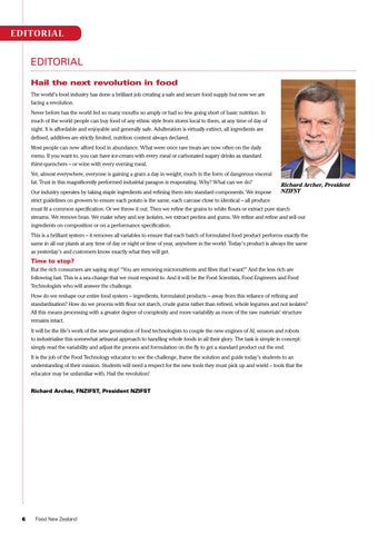 Time to stop? But the rich consumers are saying stop! “You are removing micronutrients and fibre that I want!” And the less rich are following fast. This is a sea change that we must respond to. And it will be the Food Scientists, Food Engineers and Food Technologists who will answer the challenge. How do we reshape our entire food system – ingredients, formulated products – away from this reliance of refining and standardisation? How do we process with flour not starch, crude gums rather than refined, whole legumes and not isolates? All this means processing with a greater degree of complexity and more variability as more of the raw materials’ structure remains intact. It will be the life’s work of the new generation of food technologists to couple the new engines of AI, sensors and robots to industrialise this somewhat artisanal approach to handling whole foods in all their glory. The task is simple in concept: simply read the variability and adjust the process and formulation on the fly to get a standard product out the end. It is the job of the Food Technology educator to see the challenge, frame the solution and guide today’s students to an understanding of their mission. Students will need a respect for the new tools they must pick up and wield – tools that the educator may be unfamiliar with. Hail the revolution! Richard Archer, FNZIFST, President NZIFST