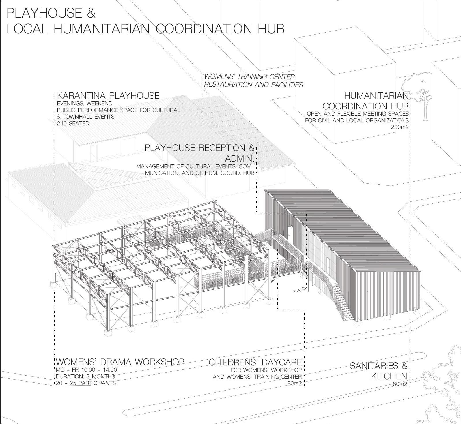 It will host workshops, performances, and simultaneaously act as the technical coordination hub of civil society groups and local NGOs: it gives visibility to the inhabitants, while encouraging the creation of communication and coordination channels.