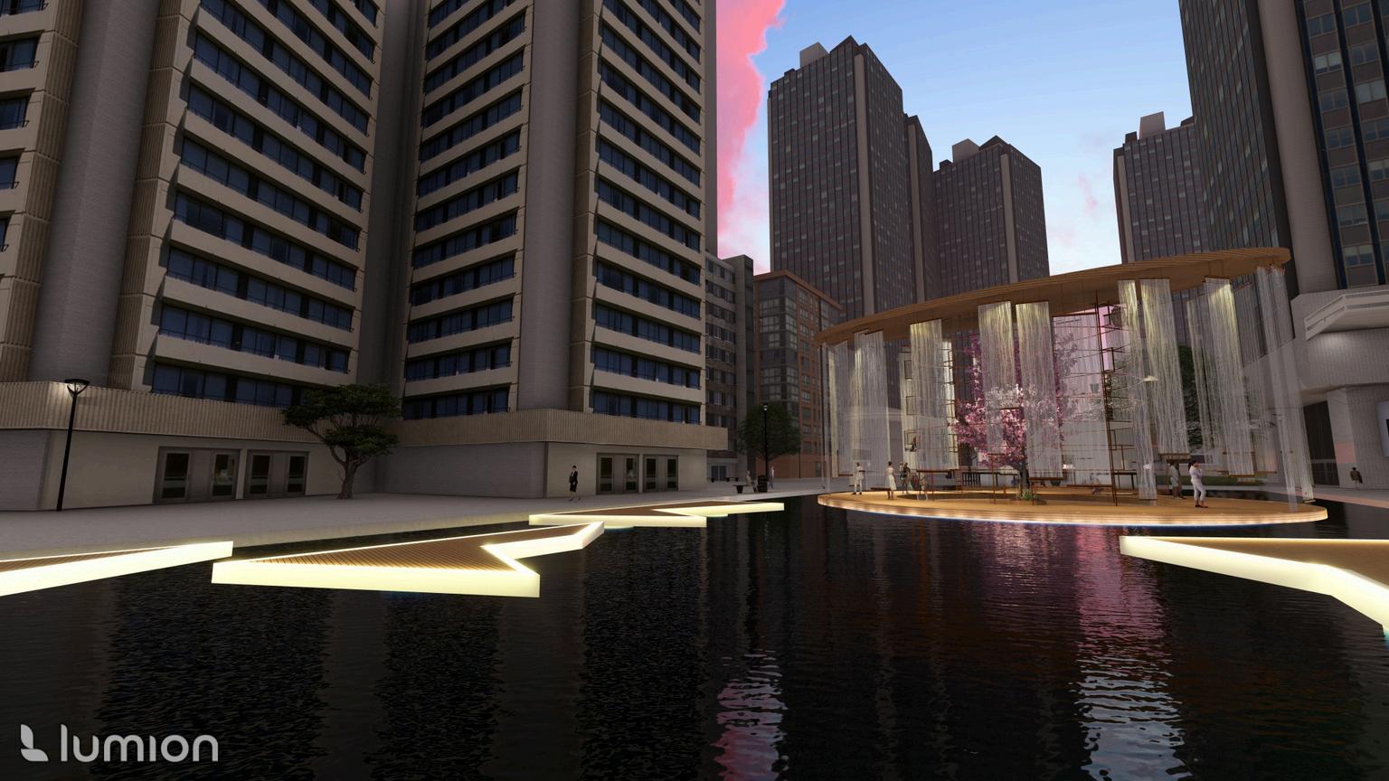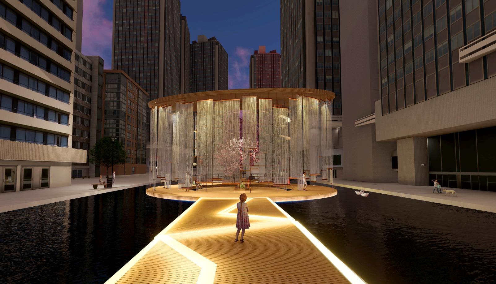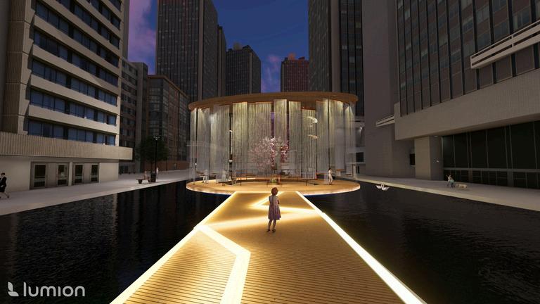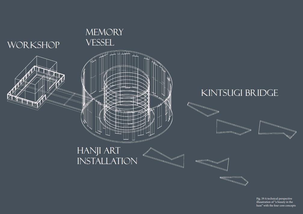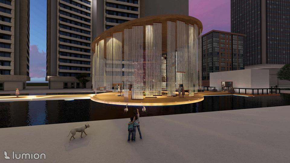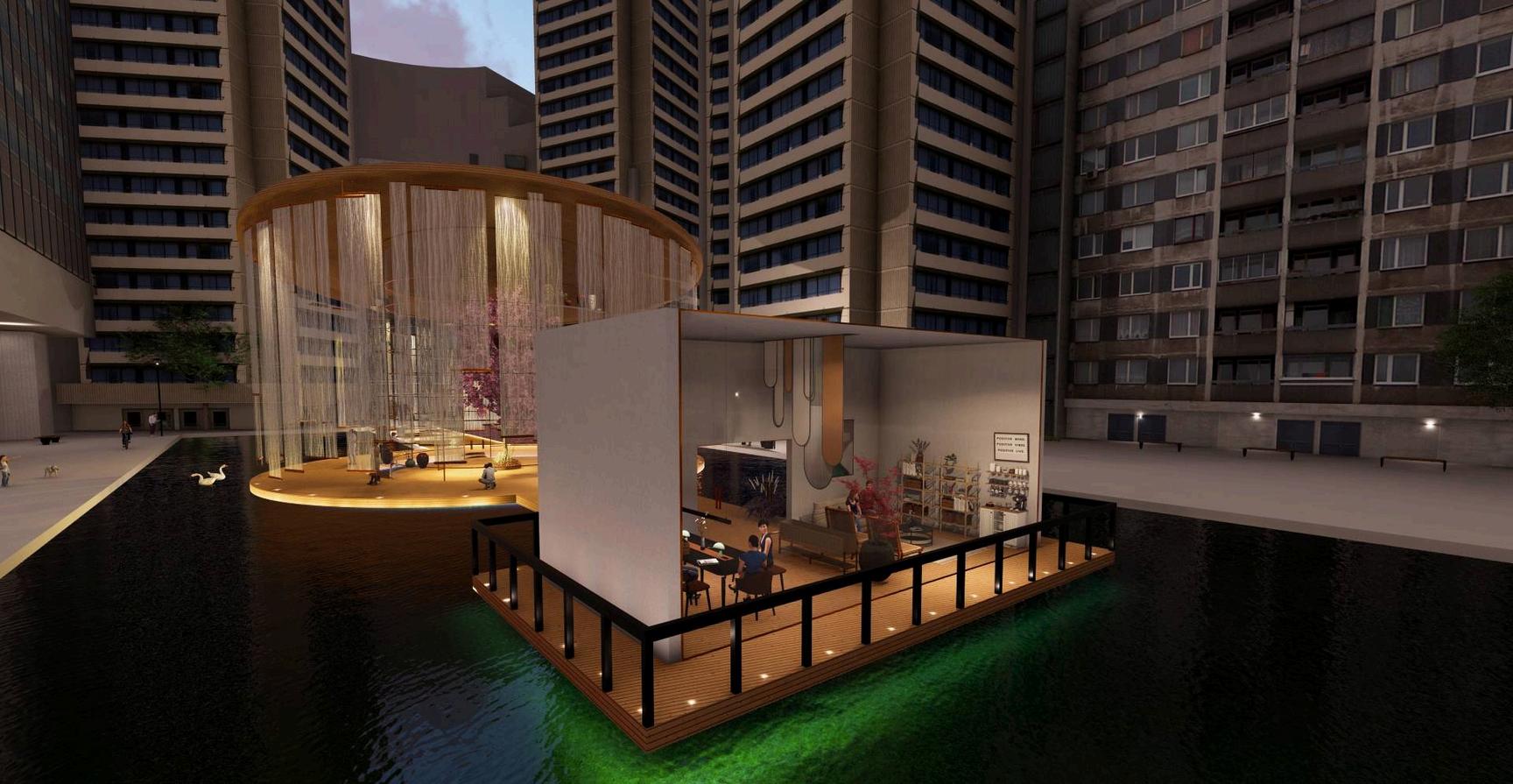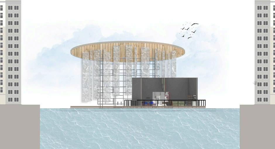 This project envisions a pavilion capturing an ambiance, serving as a poignant tribute to the houses an East Asian crafts workshop. Crafte from the sessions find a home in the "Hanji" A installation, made of mulberry paper, represe ethereal haze of our world. The evolving mem vessel within bridges temporal divides, perpe cultural narratives, and preserves timeless be Access to the floating art exhibition is via the Bridge," symbolizing unity and guiding visitor symbolic journey into the heart of the exhibiti