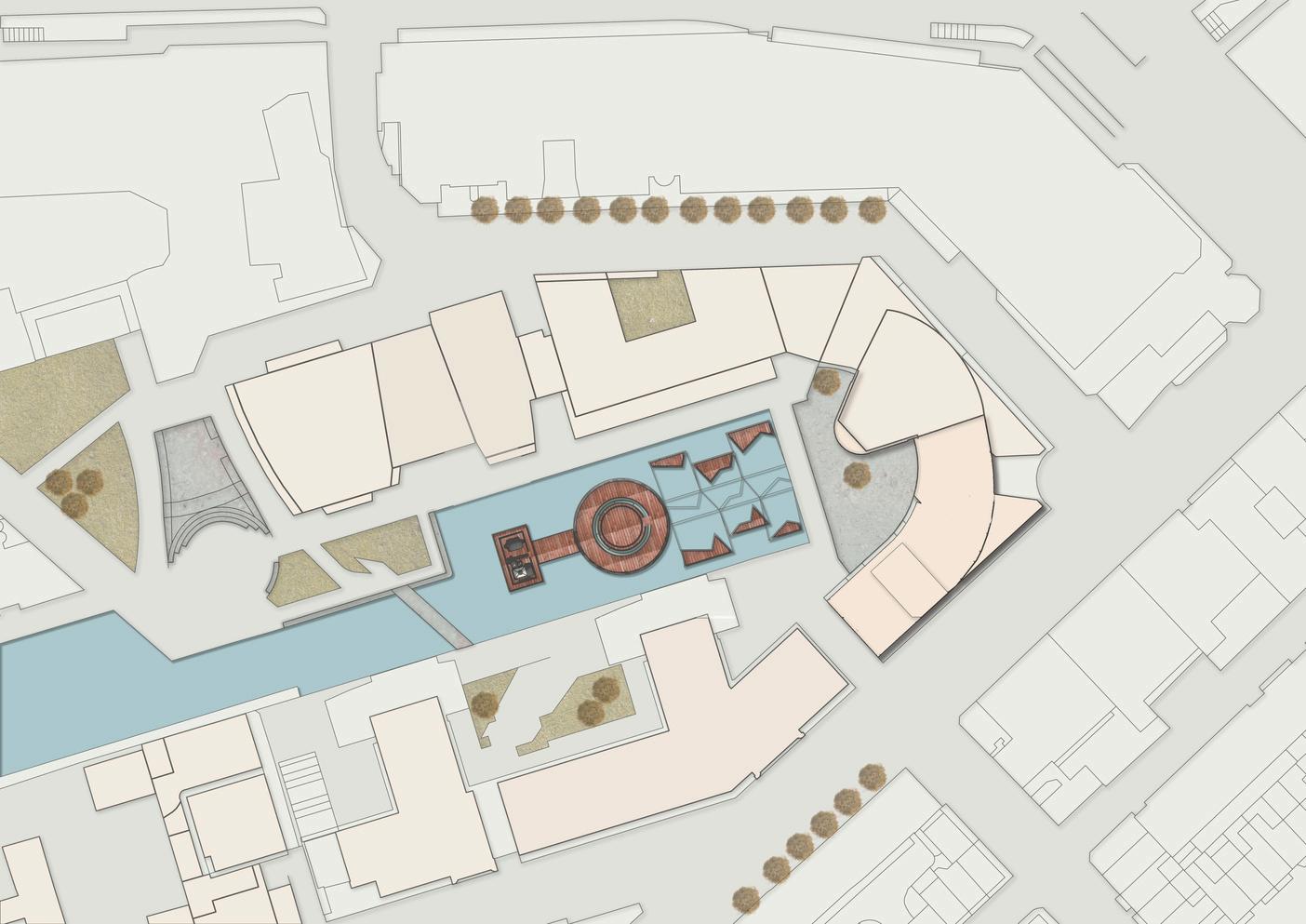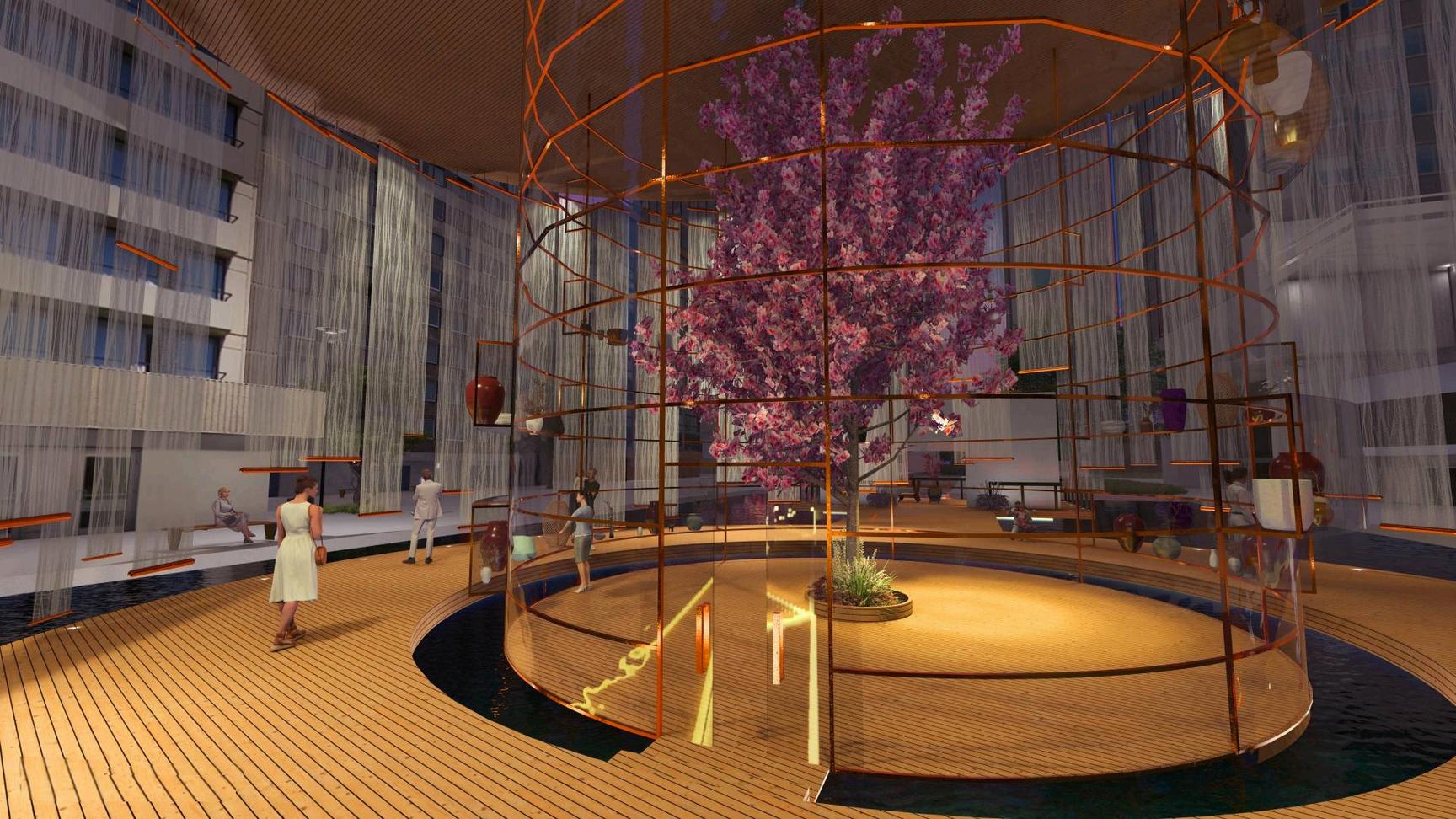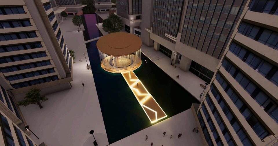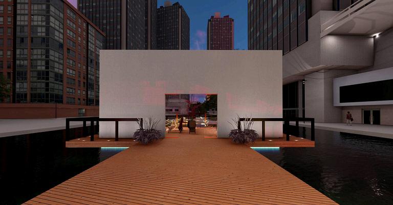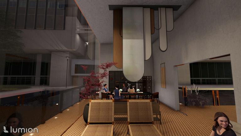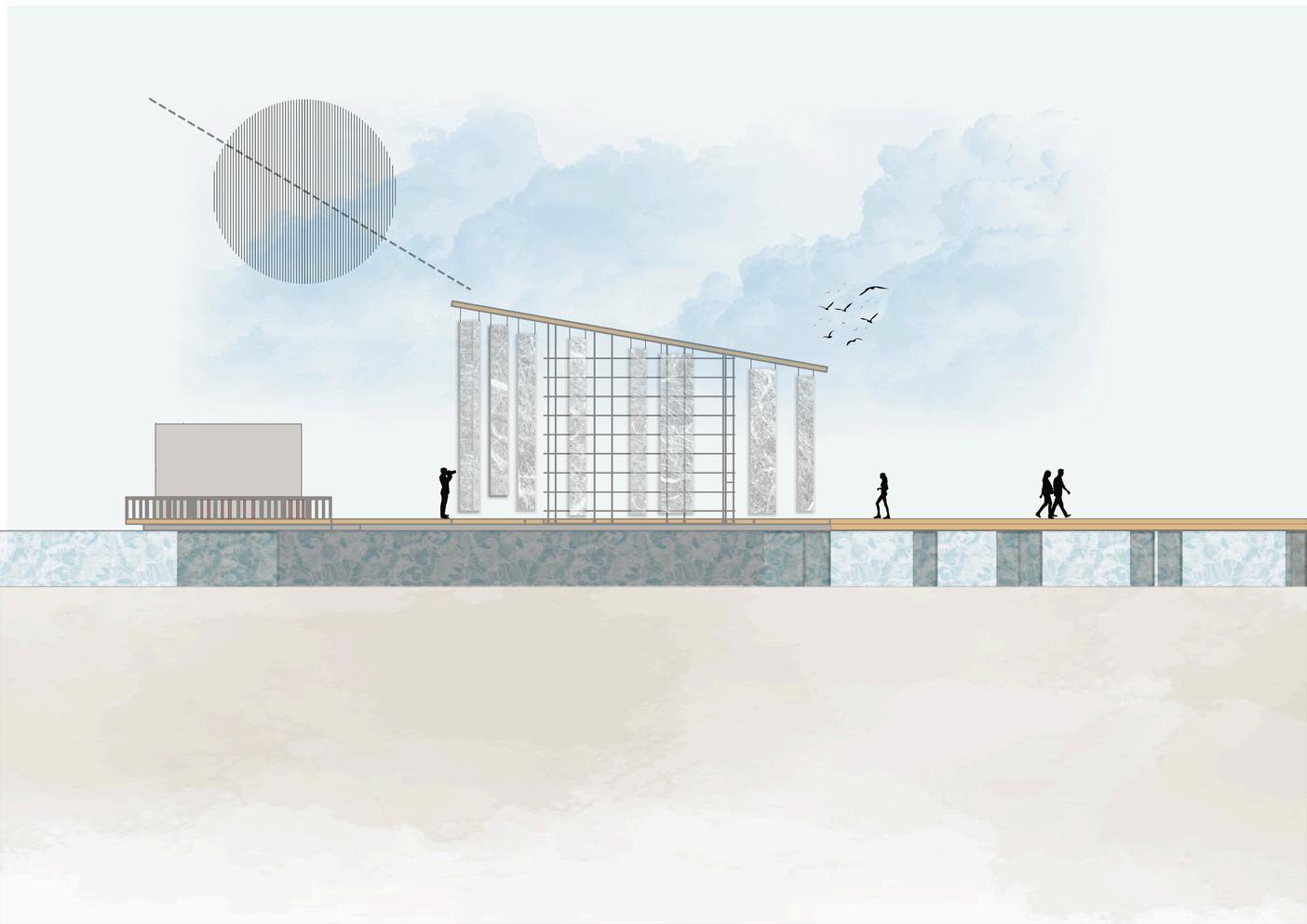 This project envisions a pavilion capturing an ambiance, serving as a poignant tribute to the houses an East Asian crafts workshop. Crafte from the sessions find a home in the "Hanji" A installation, made of mulberry paper, represe ethereal haze of our world. The evolving mem vessel within bridges temporal divides, perpe cultural narratives, and preserves timeless be Access to the floating art exhibition is via the Bridge," symbolizing unity and guiding visitor symbolic journey into the heart of the exhibiti