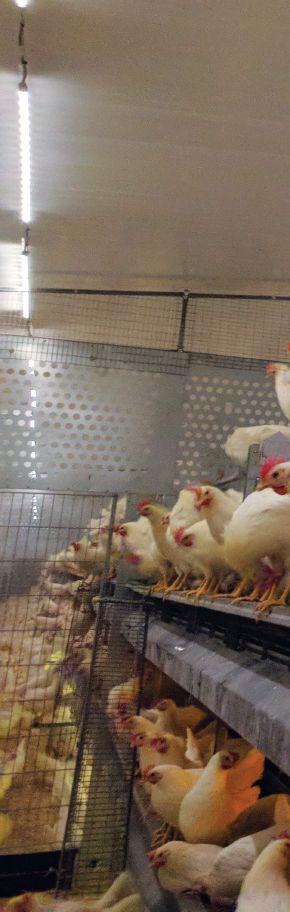 that when this housing was new to the egg industry, LEDs were installed in the aisles in dropped fixtures from the ceiling. However, today, most colony housing has ‘in-system’ central LED tubes (a string of bulbs) in each tier. There are positives or negatives to both, she notes, but whether it’s aisle lighting or central tubes, the light must be even, with the nest area darkest and the scratch/perching areas brightest.