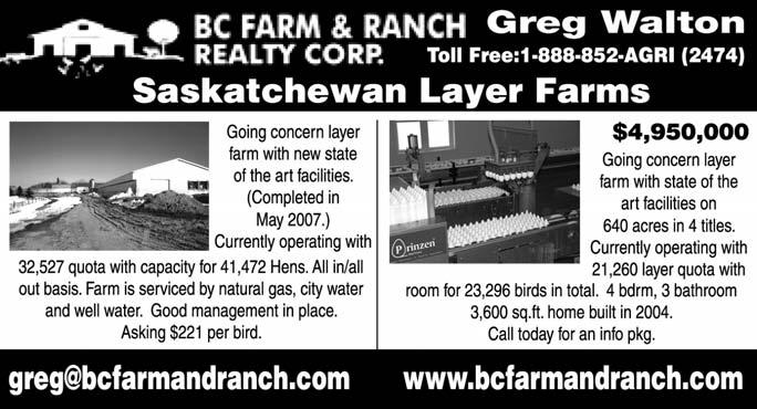 Situated on 167 acres in Western Manitoba, this feather farm boasts impressive credentials.Poultry barn, built in 1999, has a capacity for 5,700 birds. Automated feeding, egg collection, environmental and Opticon bird management systems.Heating system has capability for expansion of operation. 5,000 bird quota included.Home is a 2+2 bedroom bungalow.Off-site investment potential.