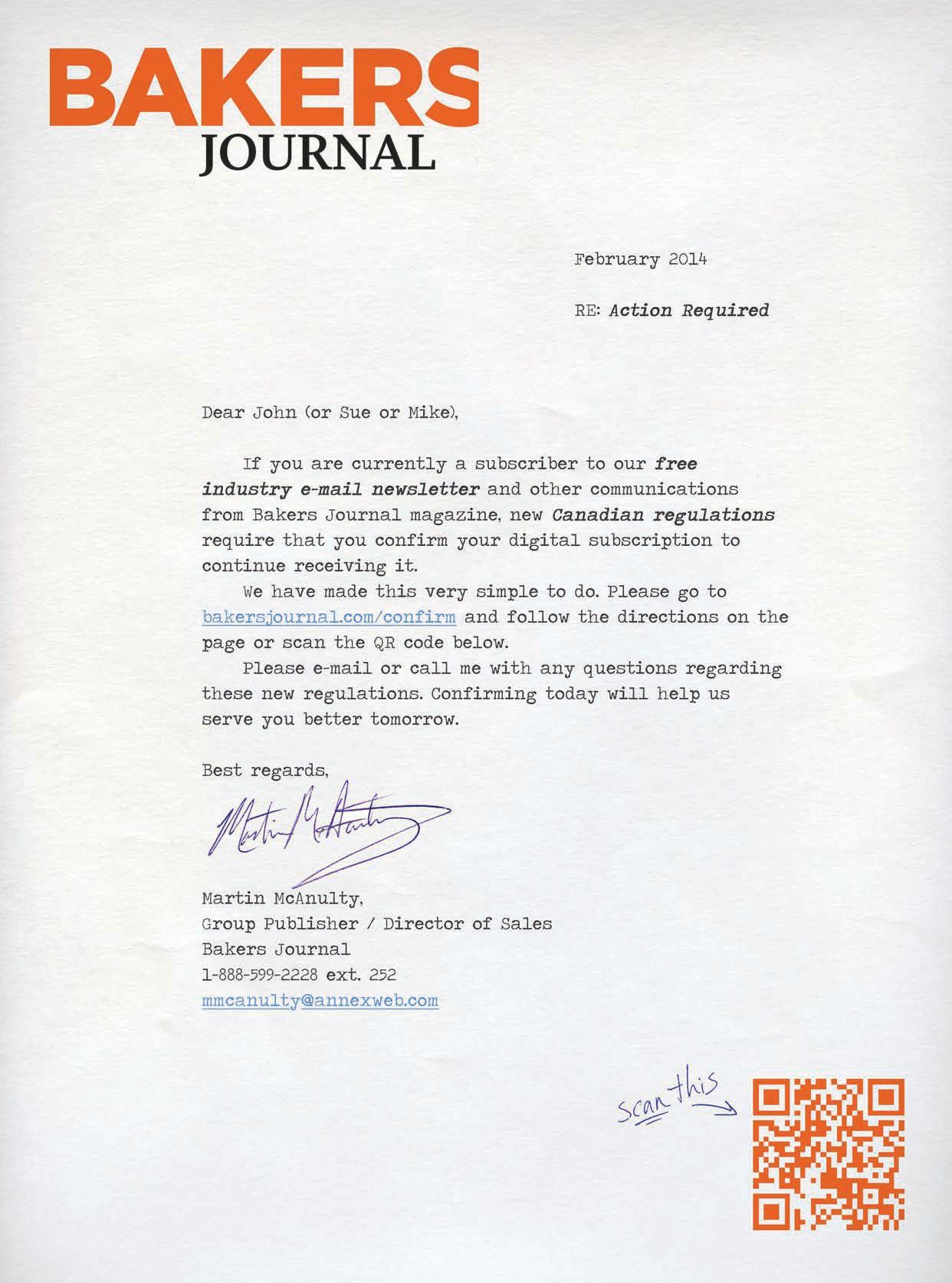 Occasionally, Bakers Journal will mail information on behalf of industry-related groups whose products and services we believe may be of interest to you. If you prefer not to receive this information, please contact our circulation department in any of the four ways listed above.