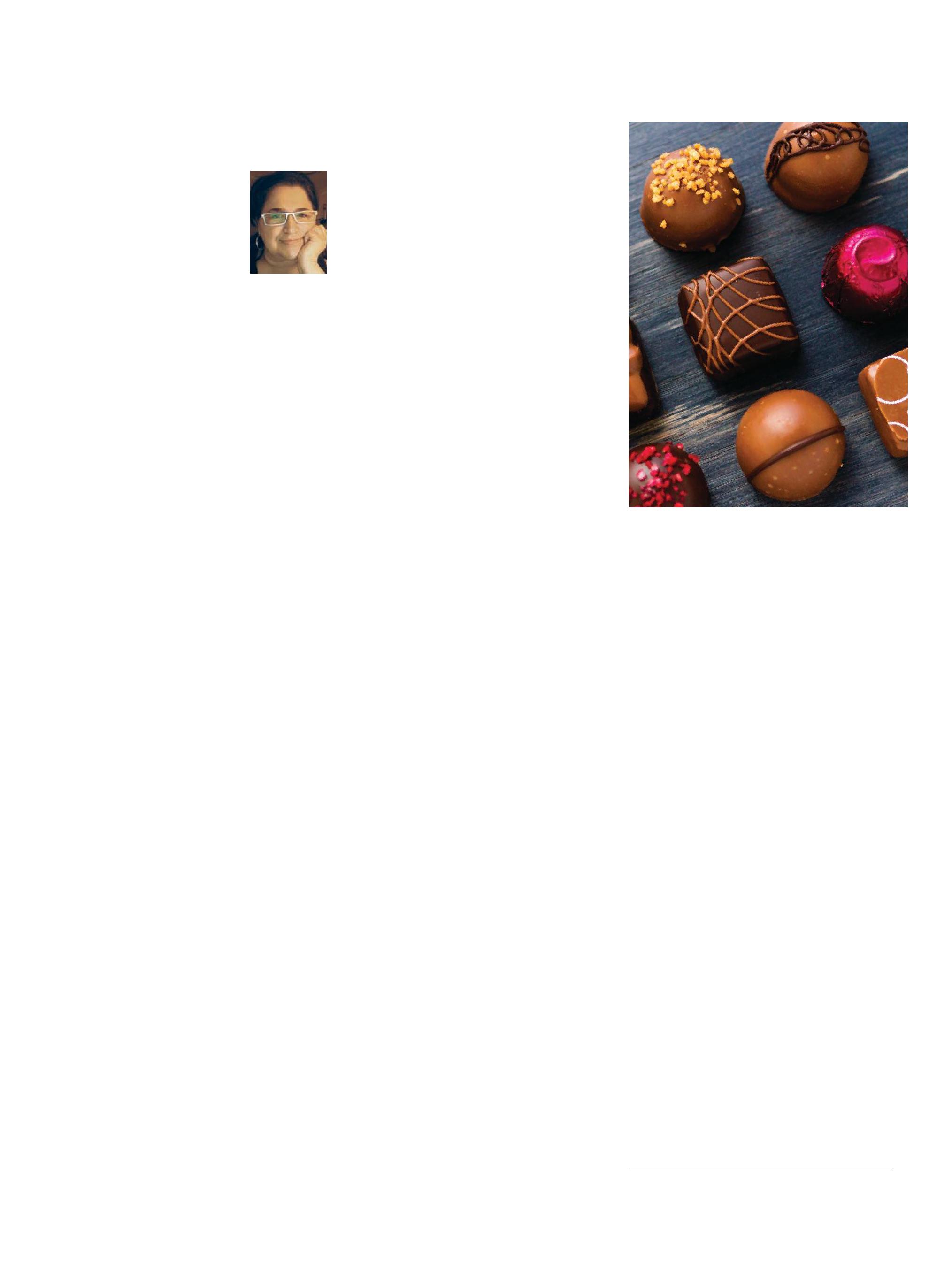 2. The film has some lovely chocolatetasting scenes: the careful first bite, the snap of the square, the crack of a filled chocolate, the outpouring, the resting on the tongue, the melting, the recognition of supporting flavours, eyes closing, eyes opening, eyes rolling. I never get tired of the swooning or watching the swoon. That’s a chocolate maker’s ideal finish line; put on this earth to make customers happy. It’s a worthy calling.